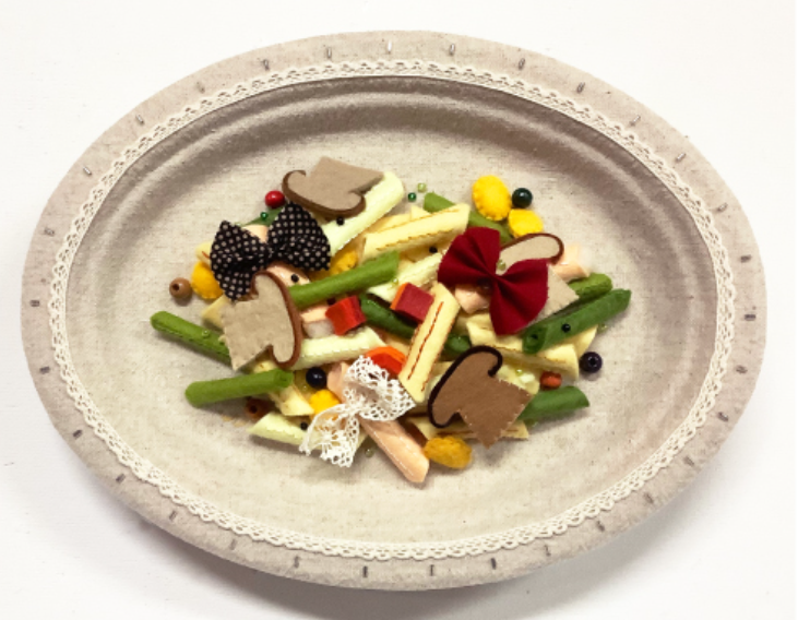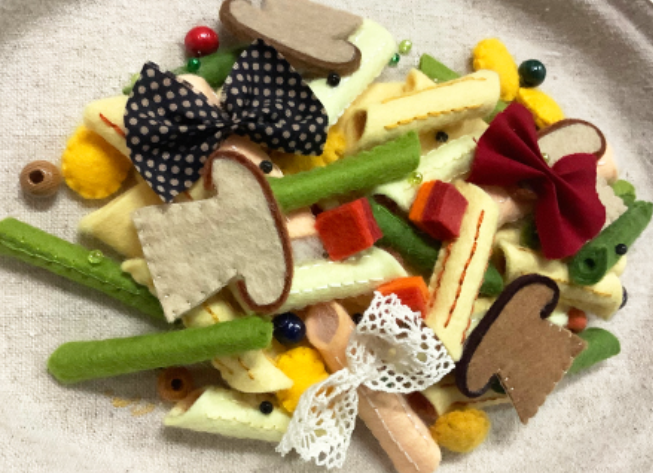 Three-dimensional sculptures inspired by various cuisines, including French and Japanese dishes, are crafted using materials such as felt, fabric, beads, and embroidery thread. The creation process involves the following steps: