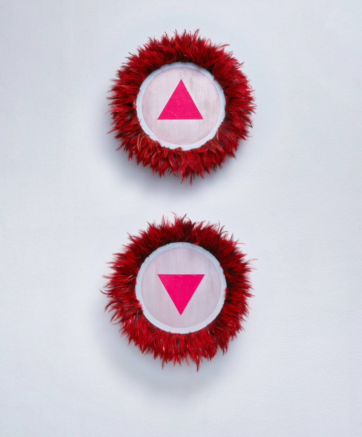 Hard to control 제어하기 힘든, 2025, Acrylic on wood, dyed feather, Dia.50*d12cm, 2pcs