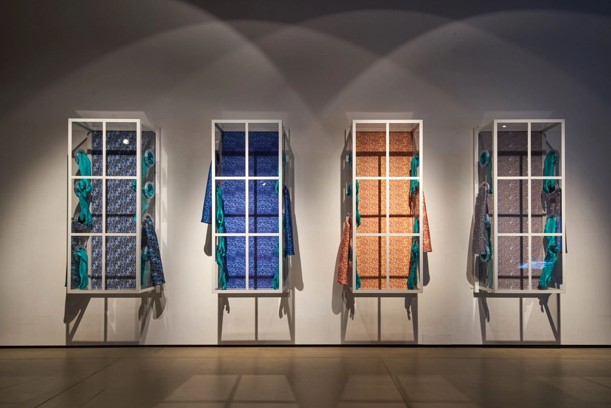 Viruscape_Four Windows 바이러스케이프_네 개의 창, 2016, Digital printing,acrylic, steel, chemical resistant gloves, h173*w75*d35cm, 4pcs