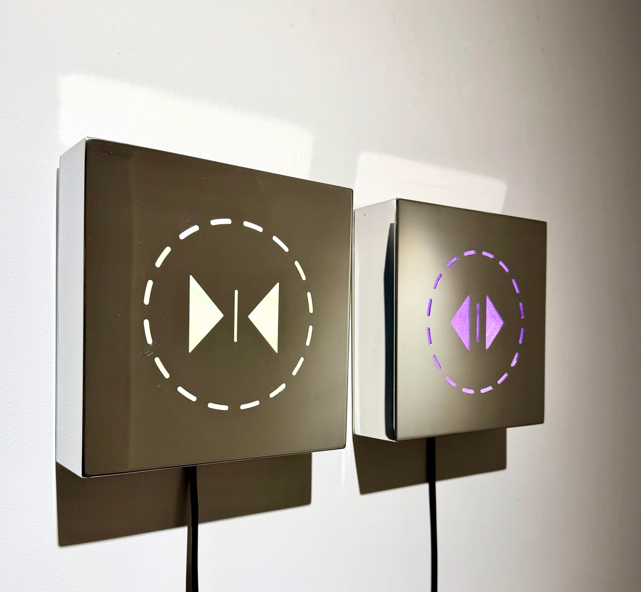 김윤경 Kim Yunkyung, Open,close_stitch line 열림, 닫힘_스티치 라인, 2025, Light panel, Stainless steel, H195*W195*D50mm, 2pcs