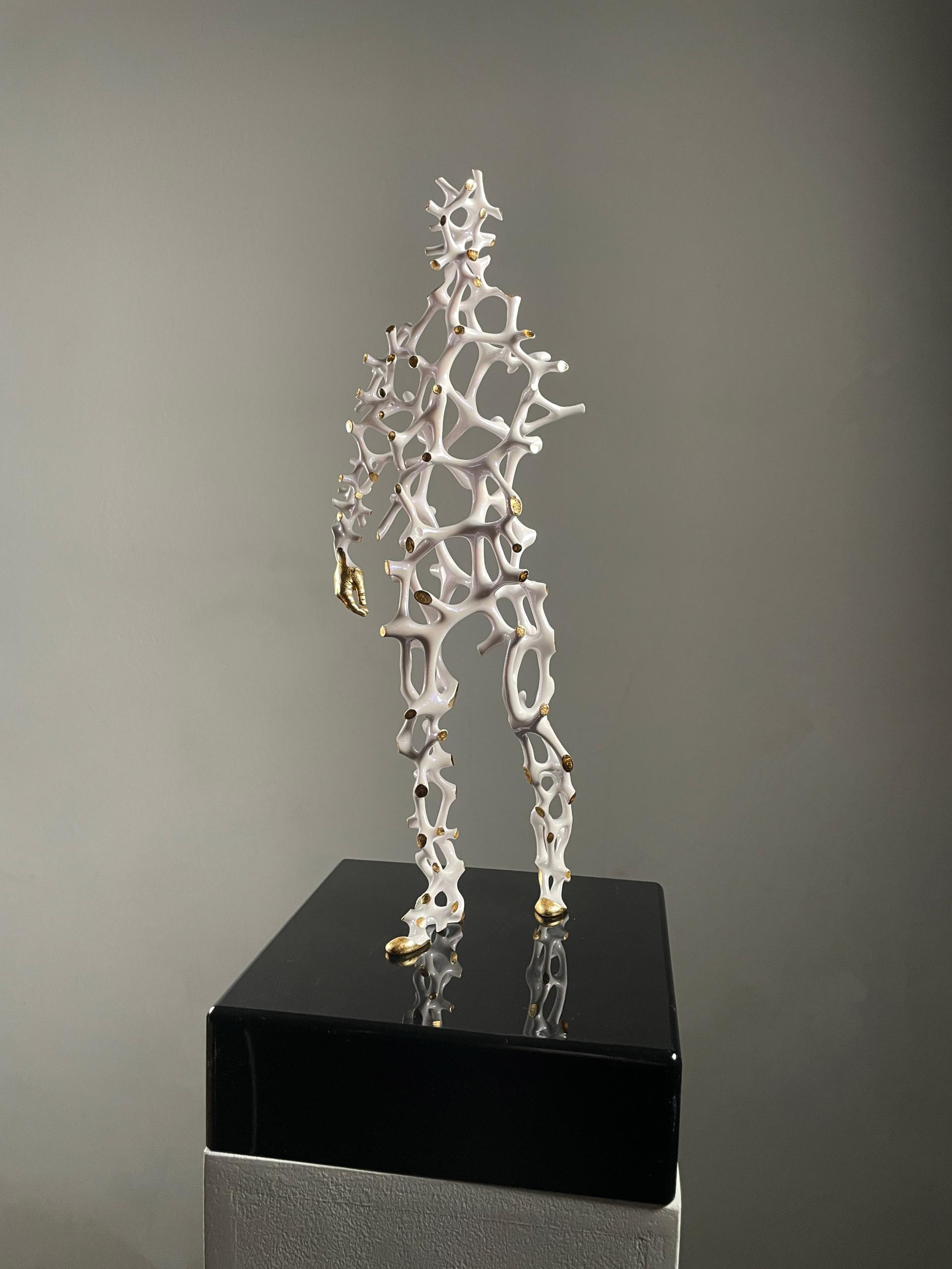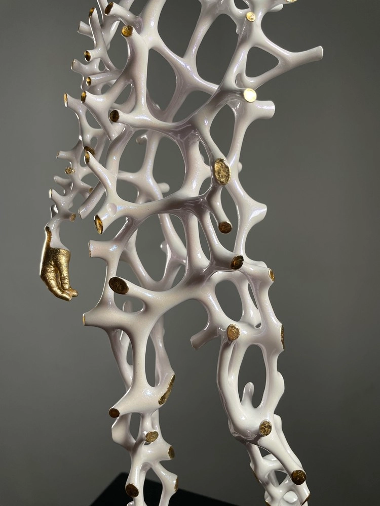 작업은 한 개인의 삶 속에서 끊임없이 이어지는 보이지 않는 선택의 과정을 인체 내부의 구조로 상상하고, 그 구조가 피부의 표면과 맞닿는 순간만 외부로 드러나도록 설계한 조각이다. 표면에 떠오른 접촉점들은 금빛으로 반짝이며, 전체 과정이 아닌 결과의 흔적만이 세계에 남는다는 사실을 시각적으로 환기한다. 그 금빛 점들은 우주의 별처럼 흩어져 한 인물의 별자리를 이루고, 관람자는 그 반짝임을 따라 선택의 항로를 더듬듯 읽어 내려간다. 내부의 흐름과 외부의 빛이 만나는 경계에서 형태는 미세한 압력과 접촉의 면적을 드러내며, 비어 있음과 연결의 리듬은 내면과 외면 사이의 숨은 대화를 형상화한다. 결국, 이 작품은 보이지 않던 수많은 결정이 세계와 접촉하는 찰나에 생성되는 빛의 좌표들을 기록하면서, 한 사람이 자신의 삶으로 어떻게 세상과 연결되는가를 조용히 증언한다.