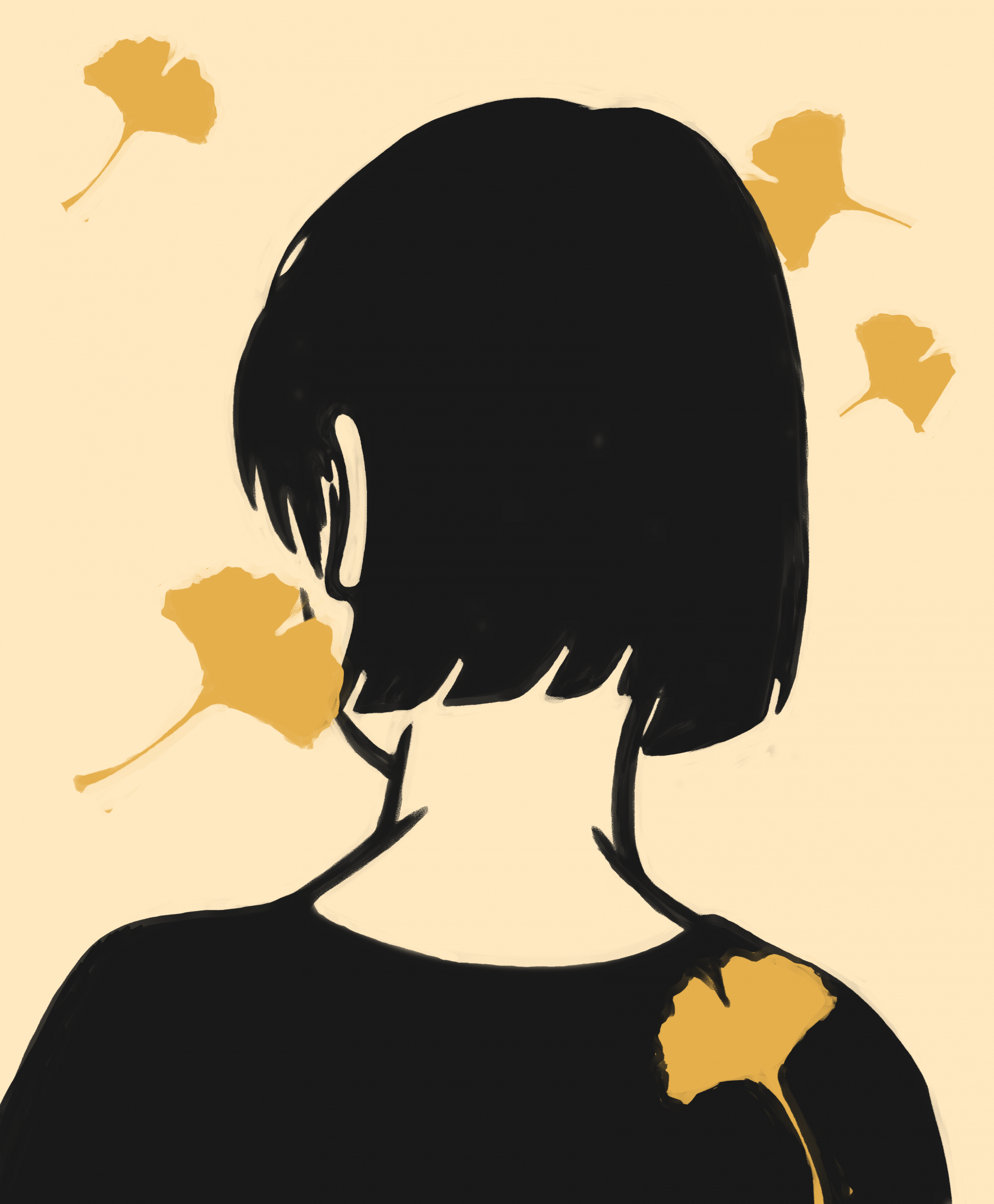 검은 옷을 입은 인물의 절제된 실루엣 위로 피어나는 푸른 선인장이나, 시선을 대신하여 날아오르는 황금빛 새, 그리고 표정을 덮은 은행잎은 단순한 장식이 아니다.