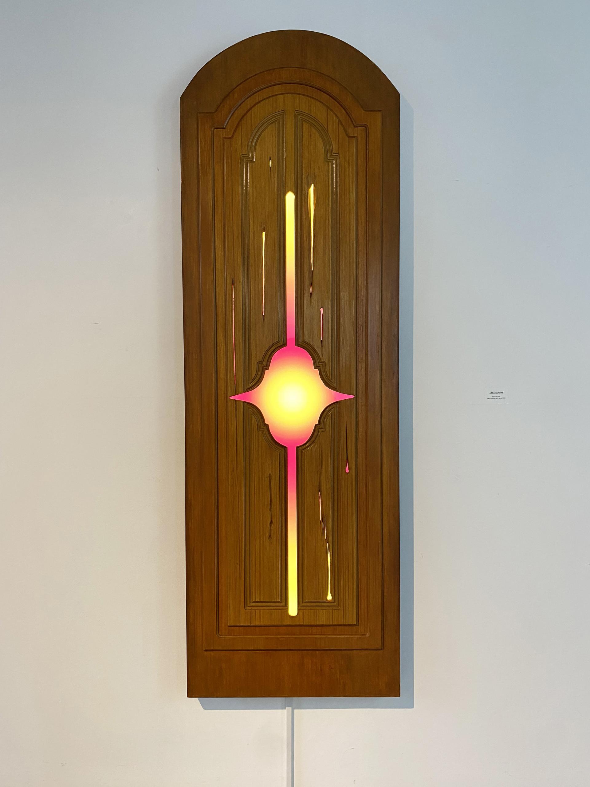 이 작품은 피처럼 흐르는 불꽃 또는 불꽃처럼 흐르는 피의 이미지를 시각적으로 표현한 설치 작업이다. 문짝의 상단을 아치형으로 변형해 중세 제단화나 고딕 건축 요소를 떠올리게 하며, 강렬하고 상징적인 분위기를 연출한다.