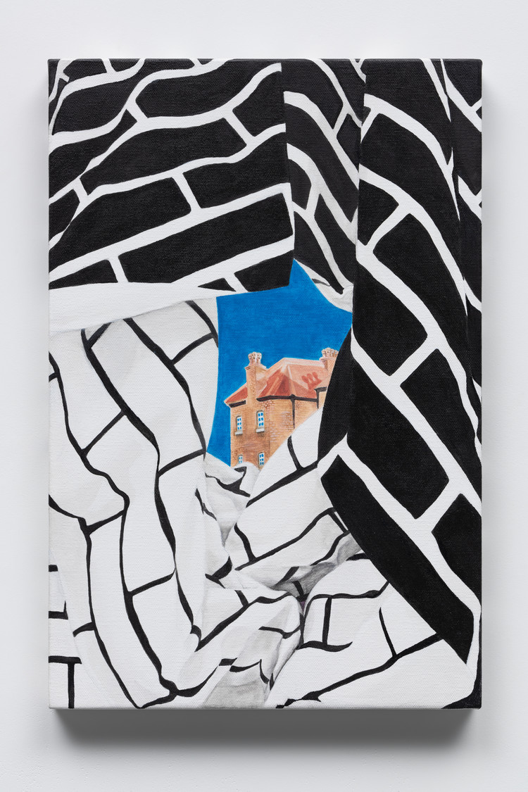 This work is a reinterpretation of an installation piece in a two-dimensional format. The brick patterns, depicted to resemble fabric, are close-up depictions of sculptural elements originally created by the artist for a performance.