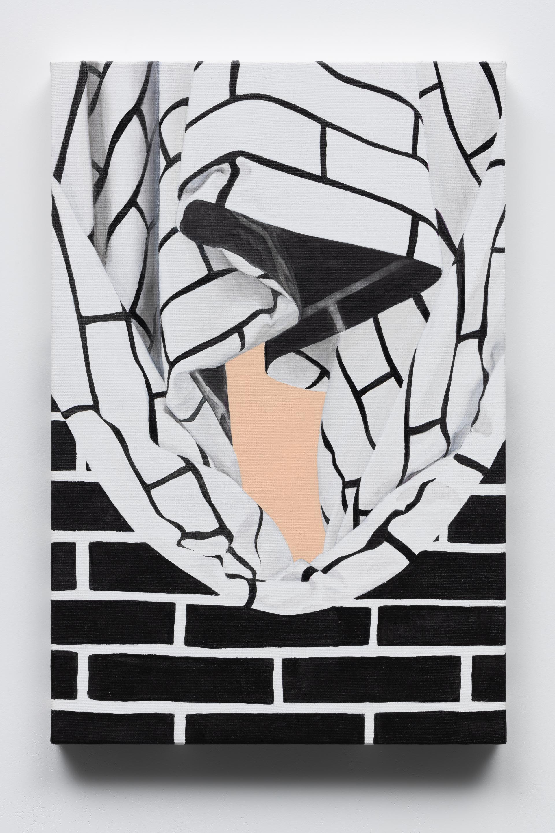 This work is a reinterpretation of an installation piece in a two-dimensional format. The brick patterns, depicted to resemble fabric, are close-up depictions of sculptural elements originally created by the artist for a performance.