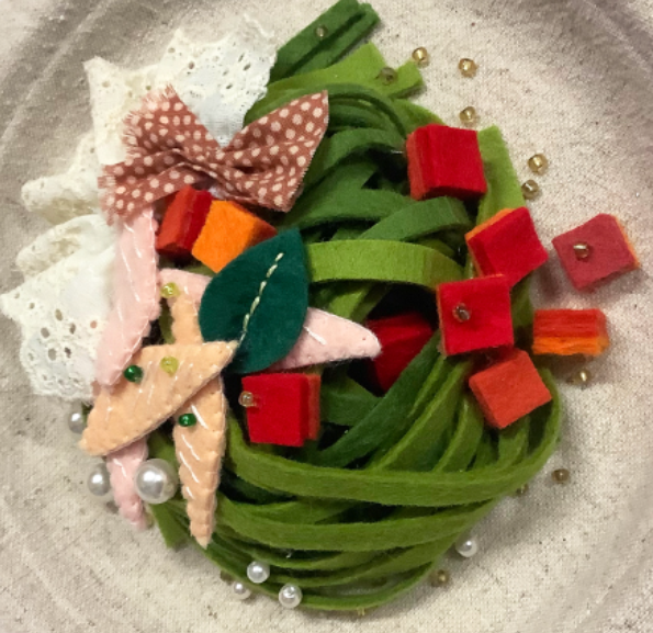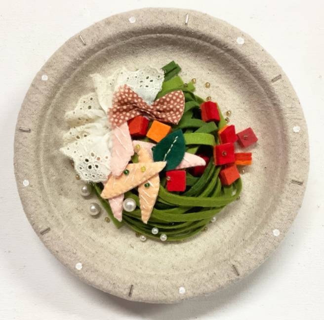 Three-dimensional sculptures inspired by various cuisines, including French and Japanese dishes, are crafted using materials such as felt, fabric, beads, and embroidery thread. The creation process involves the following steps: