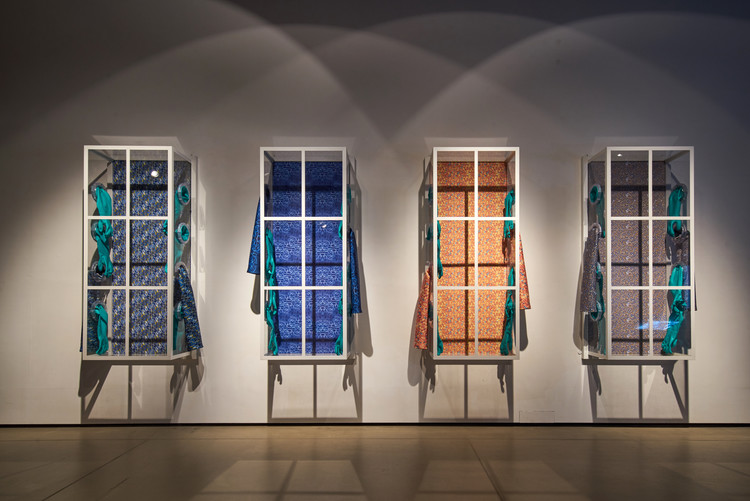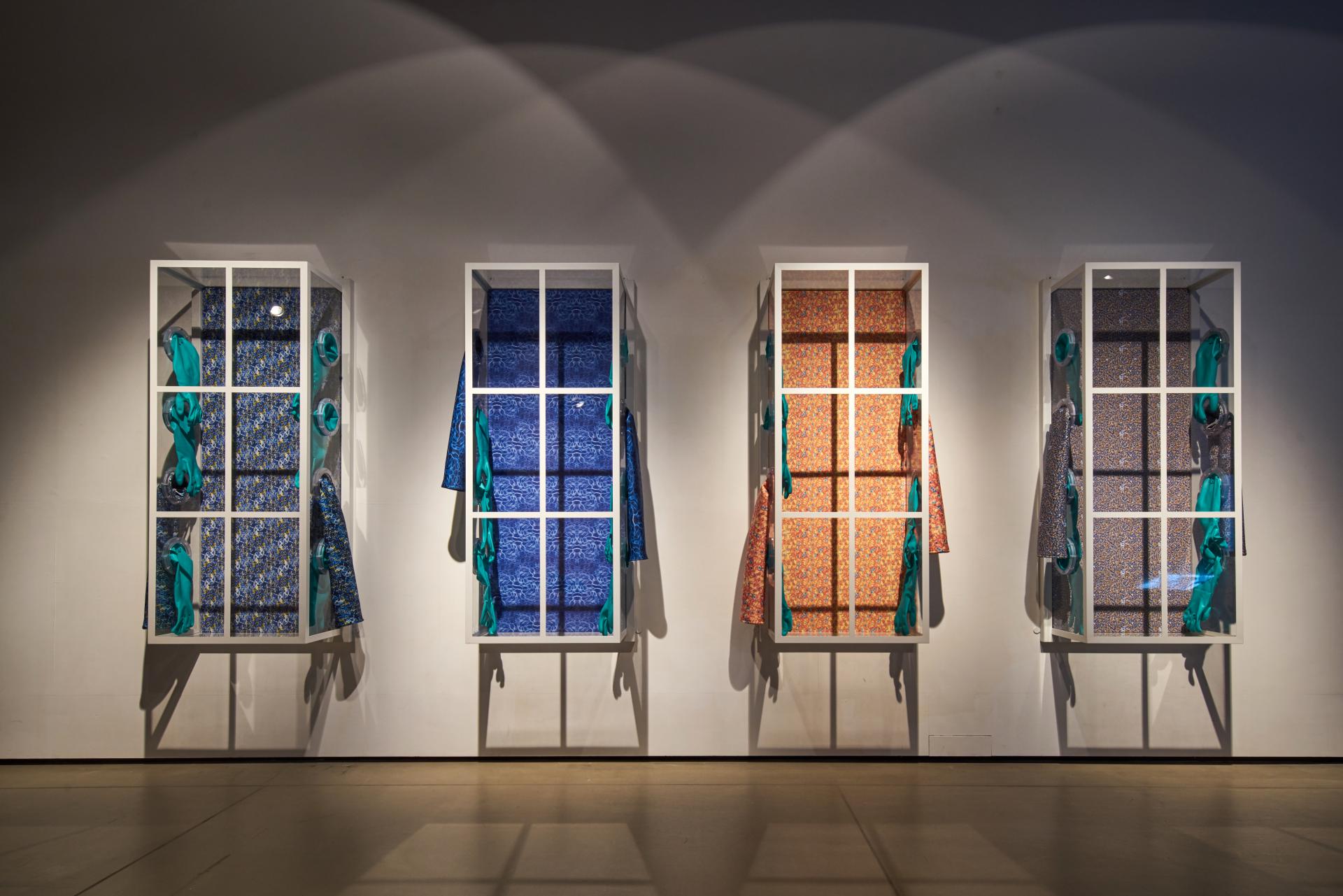 Viruscape_Four Windows 바이러스케이프_네 개의 창, 2016, Digital printing,acrylic, steel,  chemical resistant gloves, h173*w75*d35cm, 4pcs