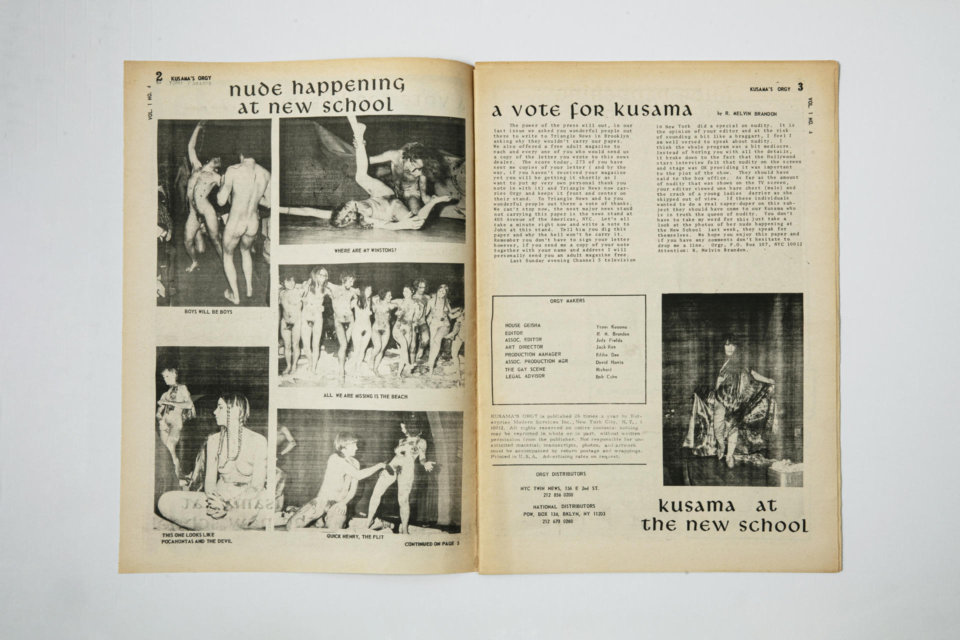 1967년 씨애틀을 거쳐 1968년 뉴욕으로 건너간 쿠사마는 퍼포먼스, 전시 등 다양한 예술활동을 펼치는 한편 1969년에 ‘누드, 사랑, 성@아름다움(nudity love sex & beauty)’라는 이름의 타블로이드 잡지 <Kusama's orgy>를 간행했다.