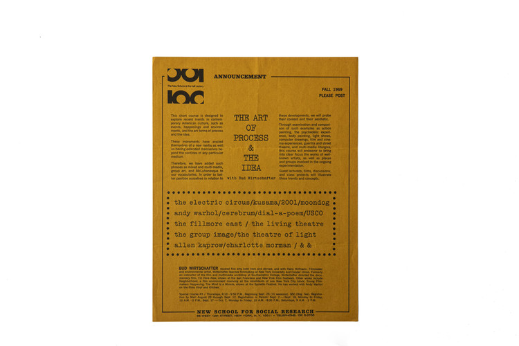 1969년 The New School For Social Research에서의 강의 안내문, 강의는 미국 내에서의 예술적으로 벌어진 일, 환경, 그리고 쿠사마, 앤디워홀, 앨런 캐프로, 샬롯 무어만등의 아티스트들의 아이디어와 그들의 예술적 과정의 동향을 주제로 진행되었다.