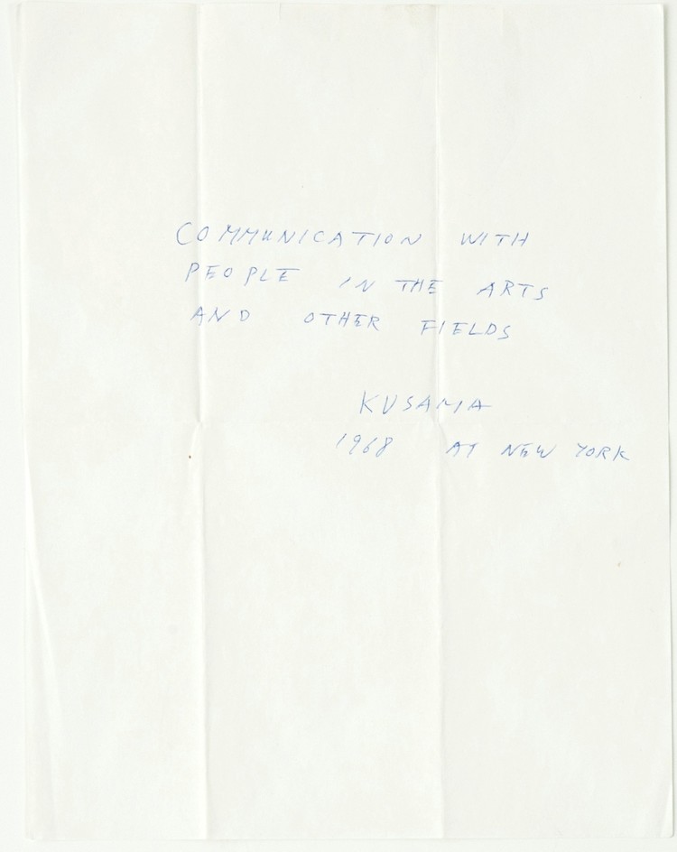 쿠사마 야요이가 수기로 작성한 "예술, 그리고 다른 분야의 사람들과의 소통"에 대한 메시지. 서명감정회사 토드뮬러사(Todd Mueller Autographs, 미국 콜로라도 위치)의 친필 확인증서가 첨부되어 있다.