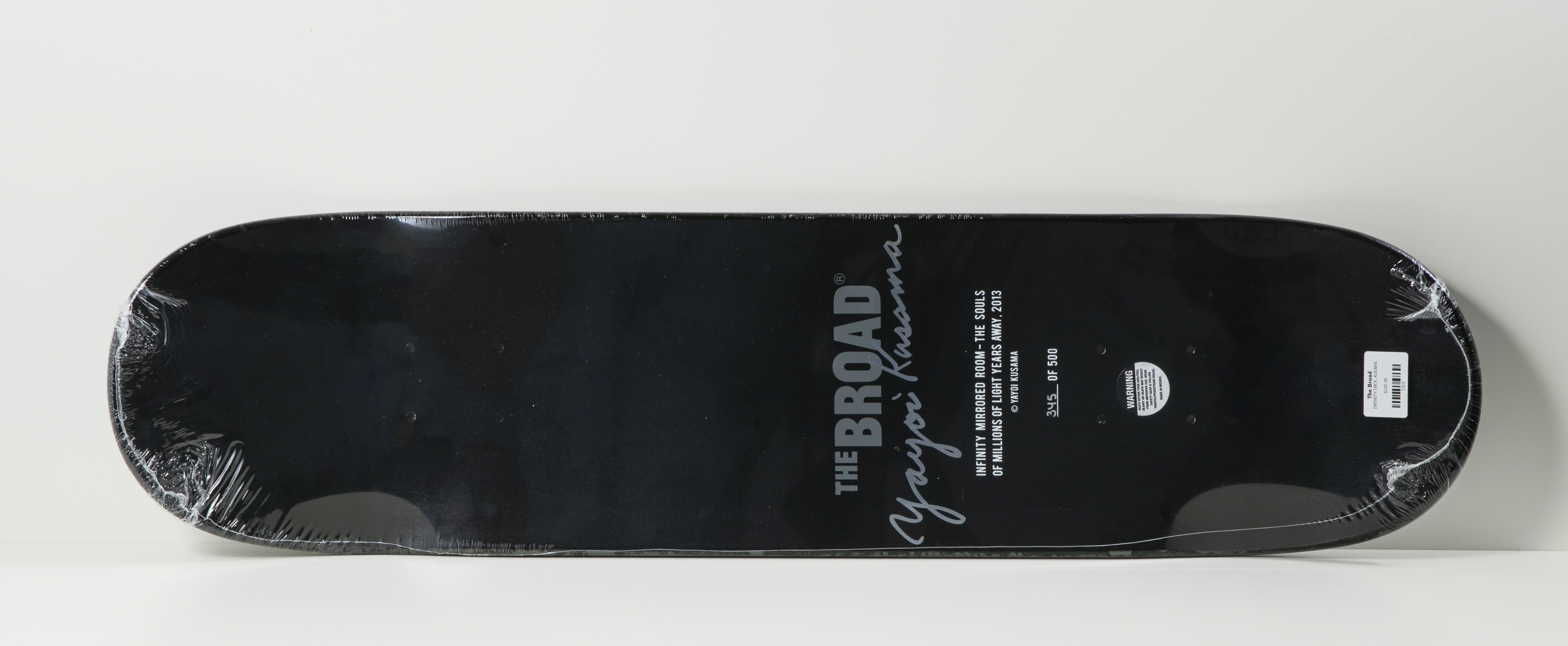 쿠사마 야요이의 500개 중에 345번째 리미티드에디션 무한의 방 (Infinity Room) 스케이트보드 데크. 보드 디자인으로 그녀의 '무한한 거울의 방 - 수 백만 광년 떨어져있는 영혼들(Infinity Mirrored Room – The Souls of Millions of Light Years Away )' 작품이 프린트되어있다.