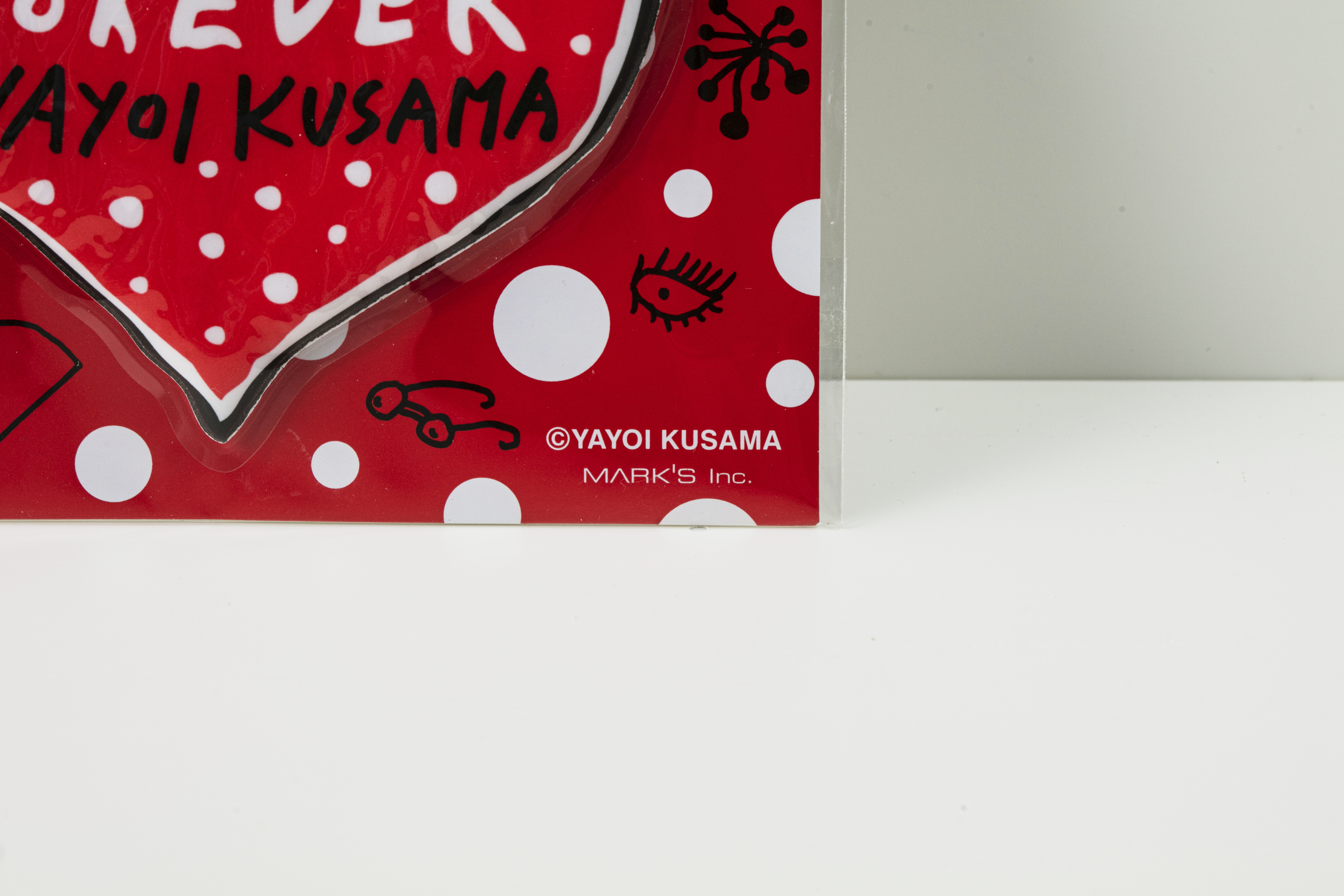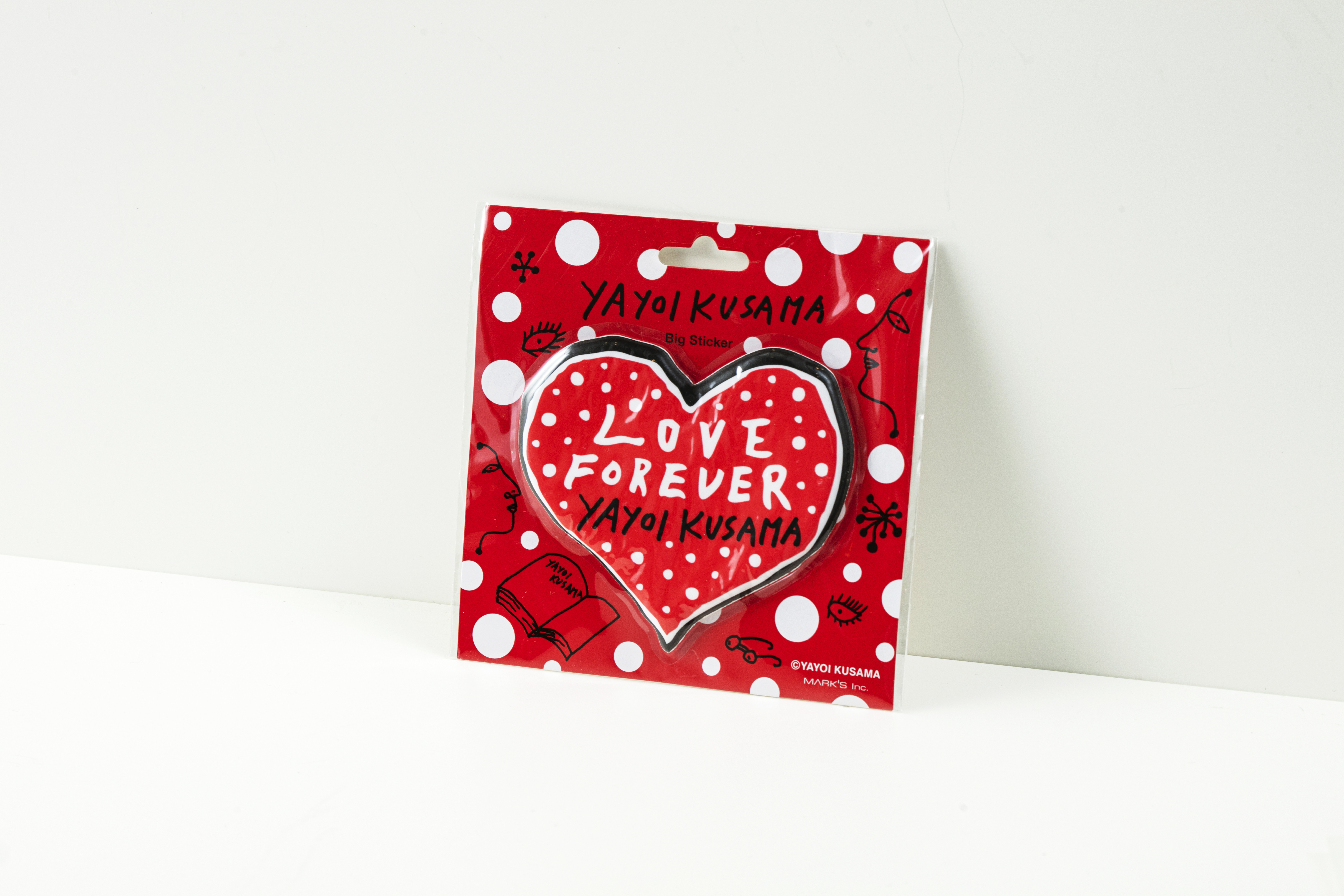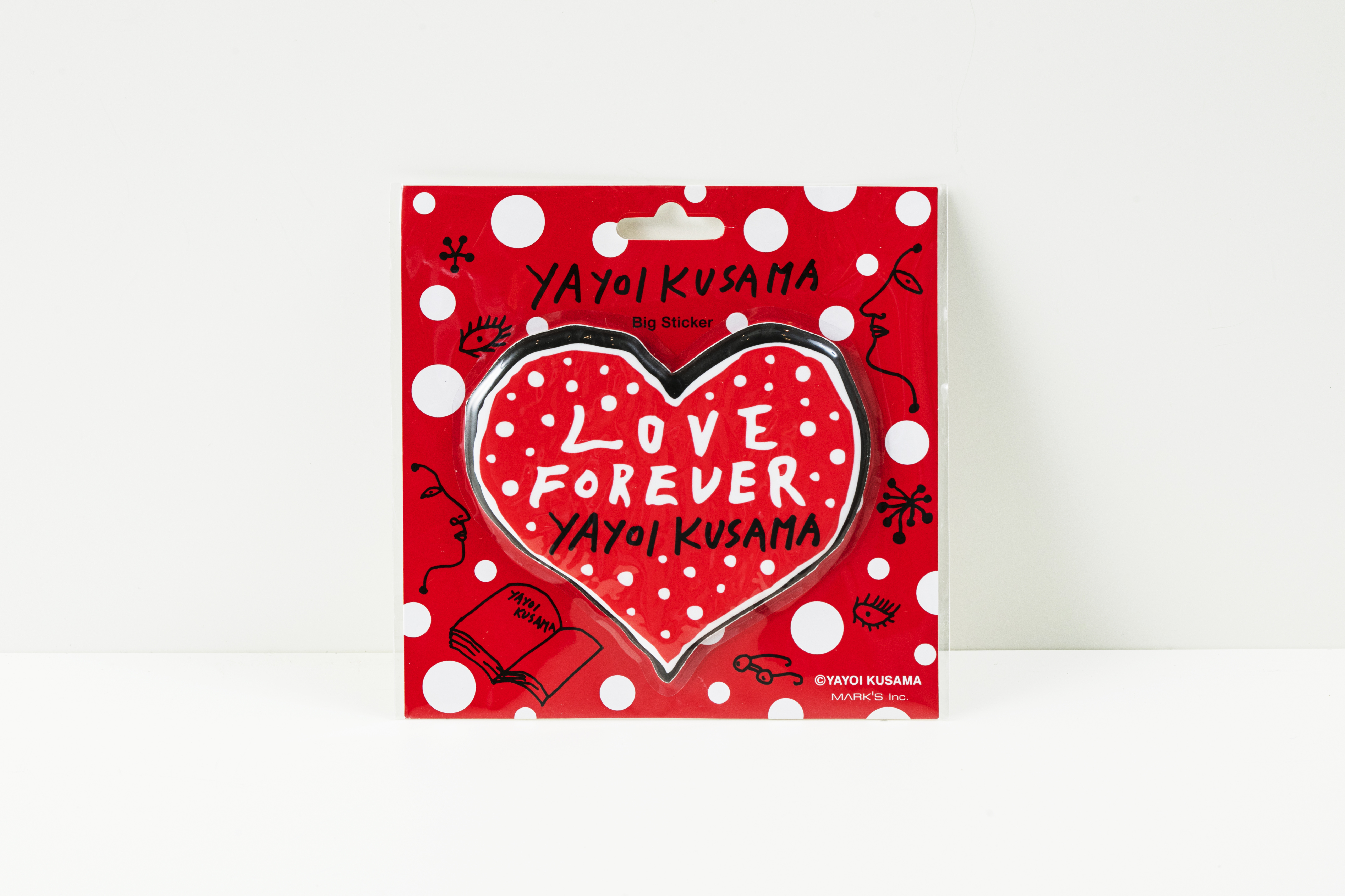 일본을 대표하는 동시대 미술의 거장 쿠사마 야요이와 일본에서 설립된 문구 및 소품 제조사 Mark’s 가만나 그녀의 최근 드로잉 '심장(Heart)'로 제작된 스티커이다.