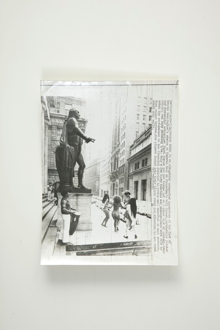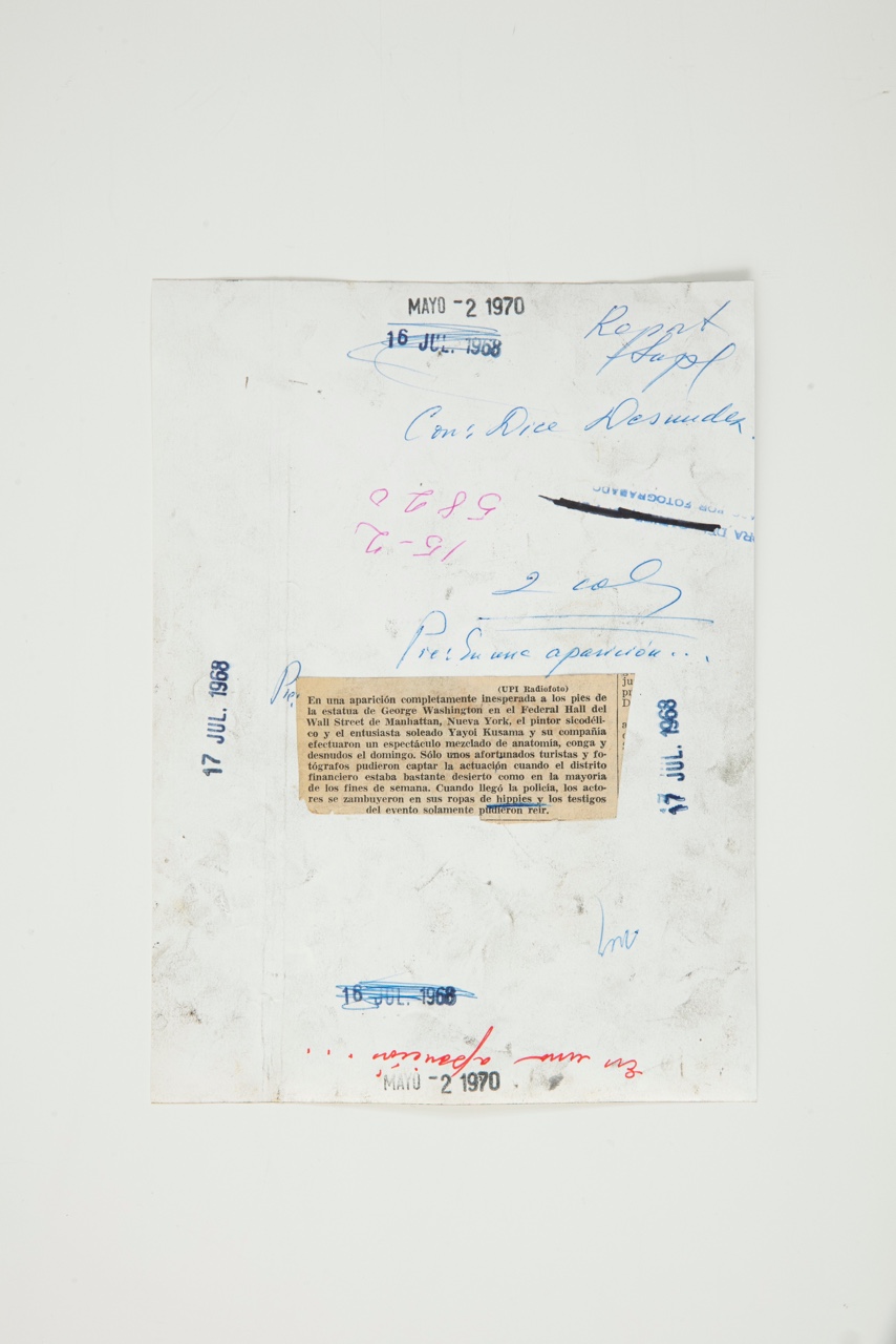 "사이키델릭 화가 쿠사마, 월스트리트의 조지워싱턴 동상 앞에 예상치 못한 모습으로 등장" 이라는 내용의 신문 기사가 스크랩되어 있다.