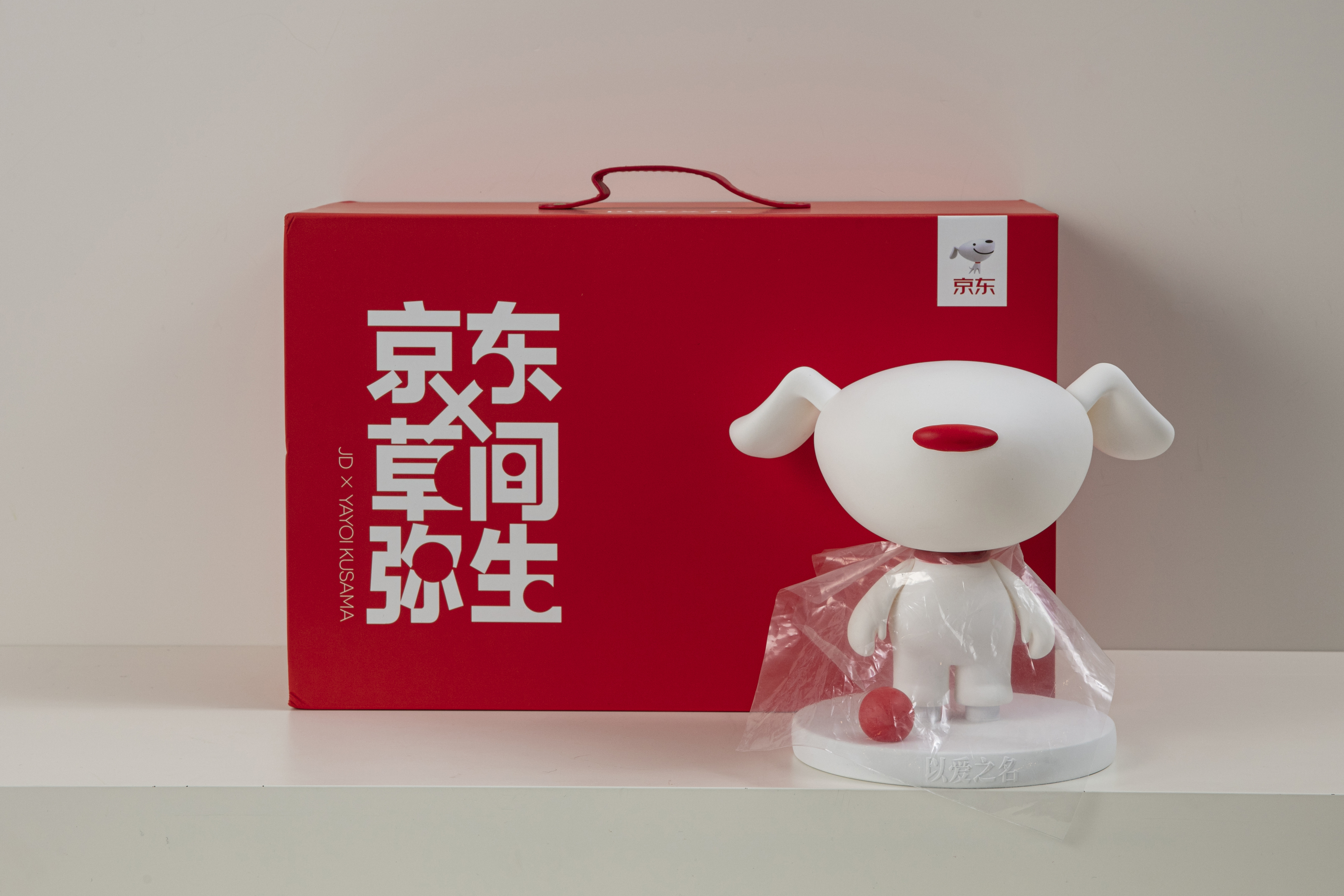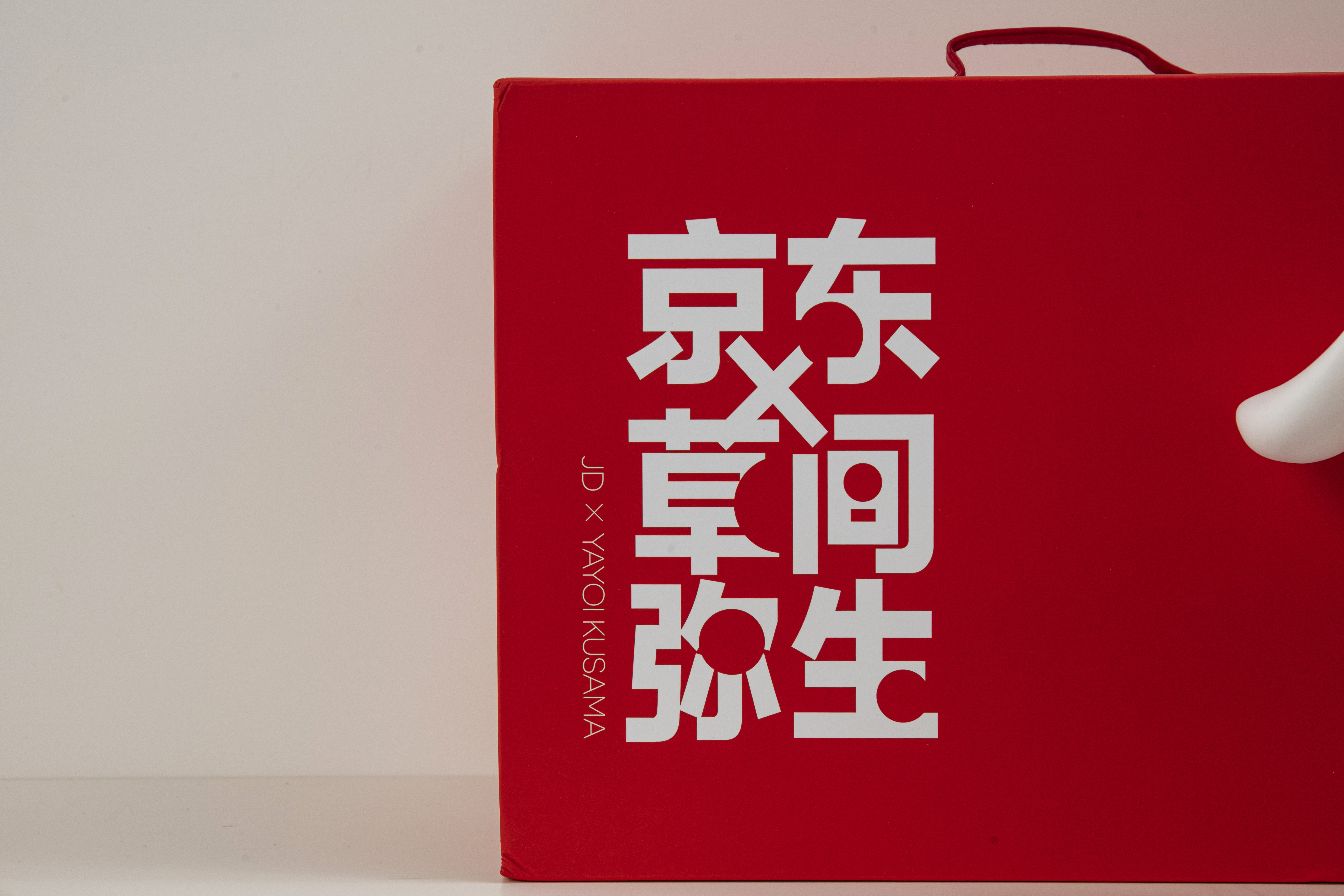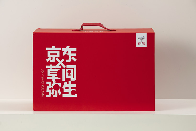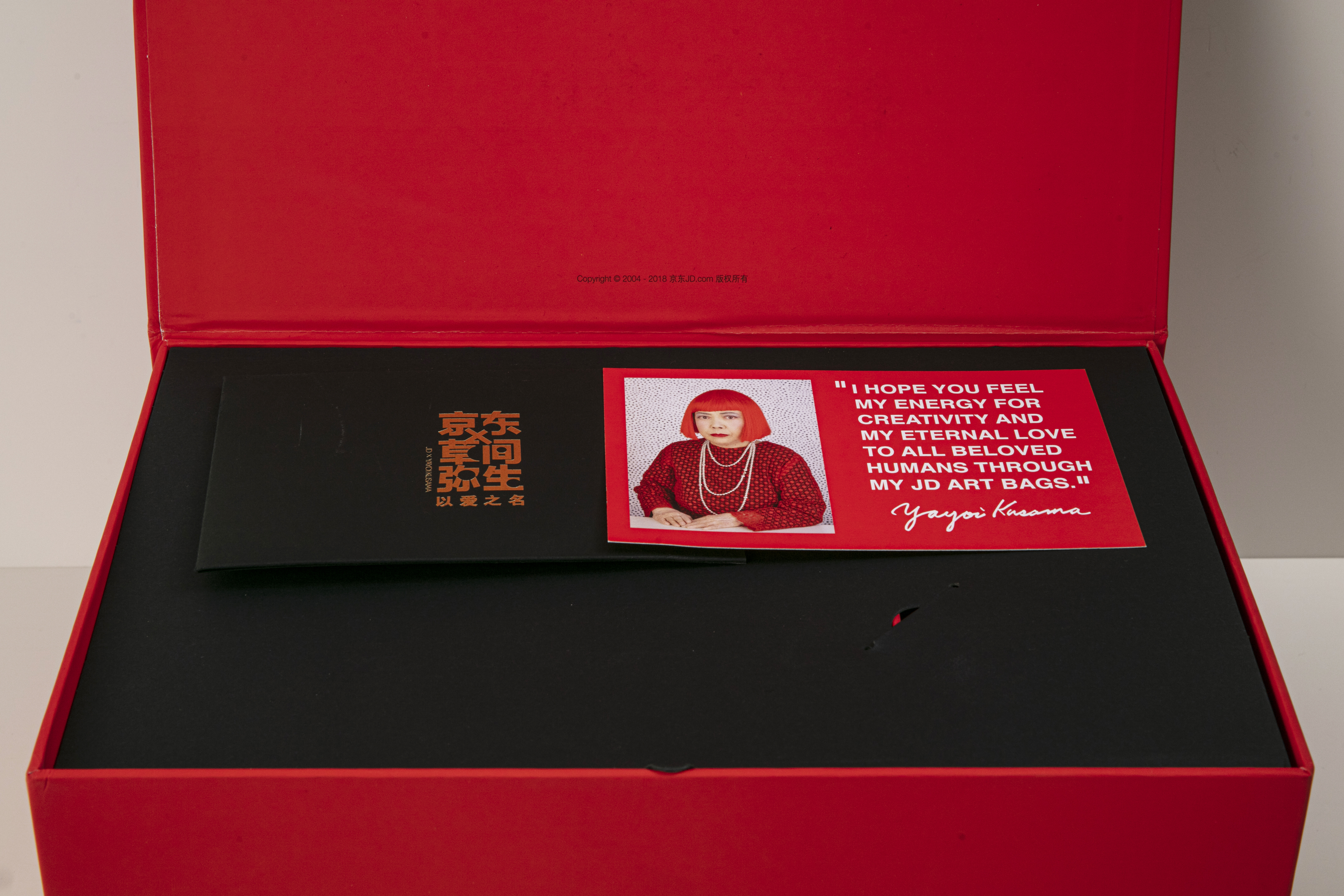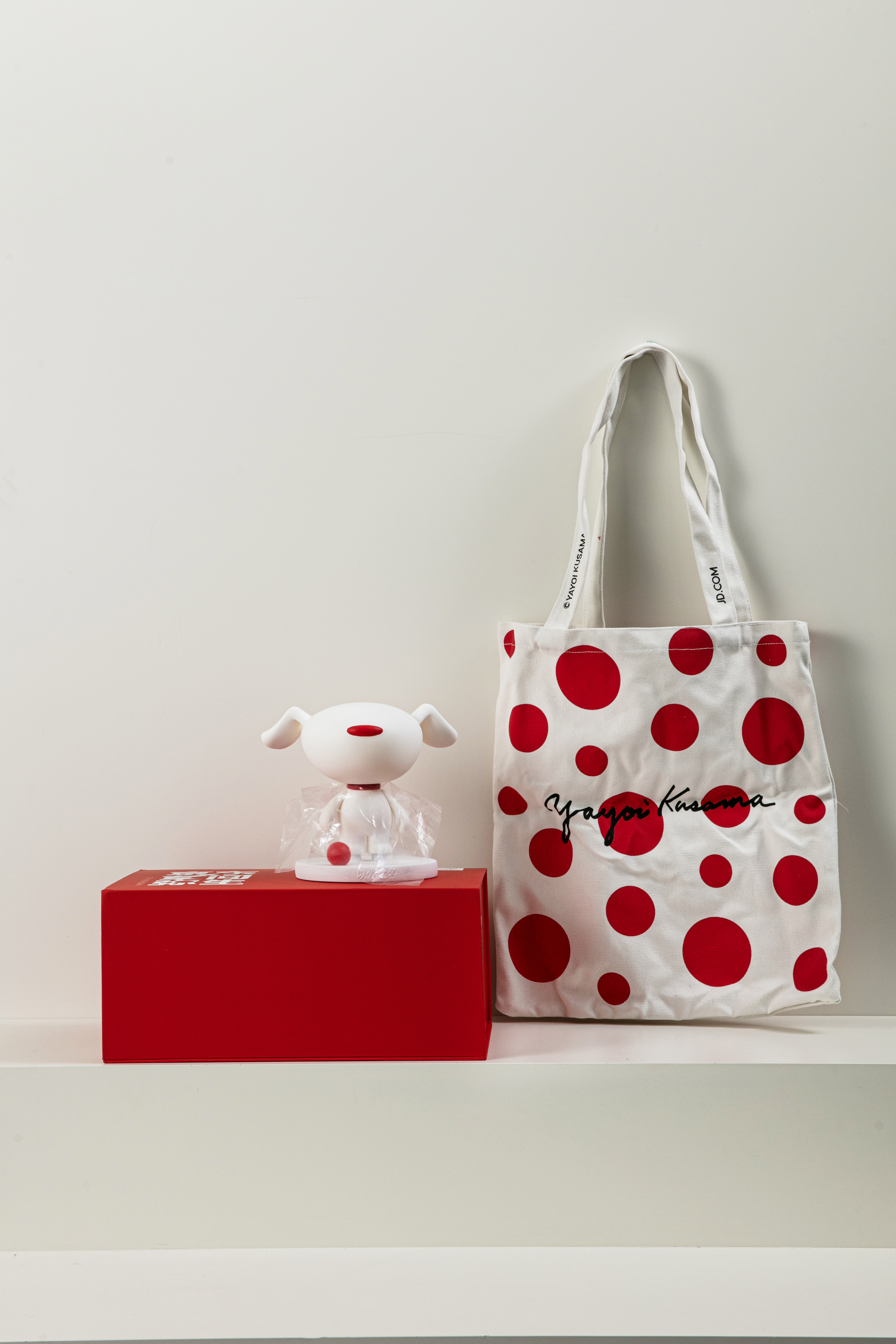빨간색 박스안에, 쿠사마와 JD.com가 협력한 캔버스 가방과, JD.com로고 조각품이 들어가있다.