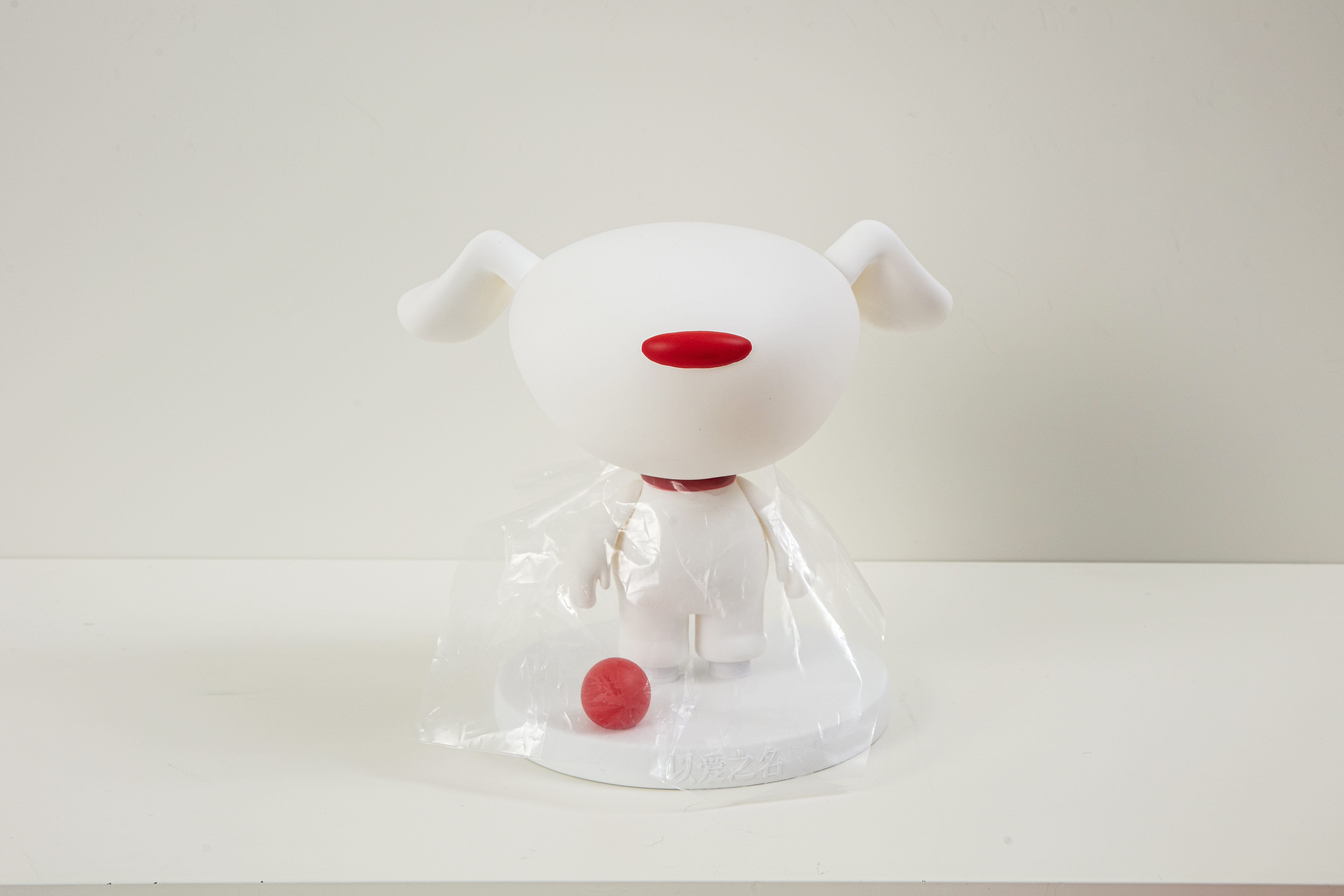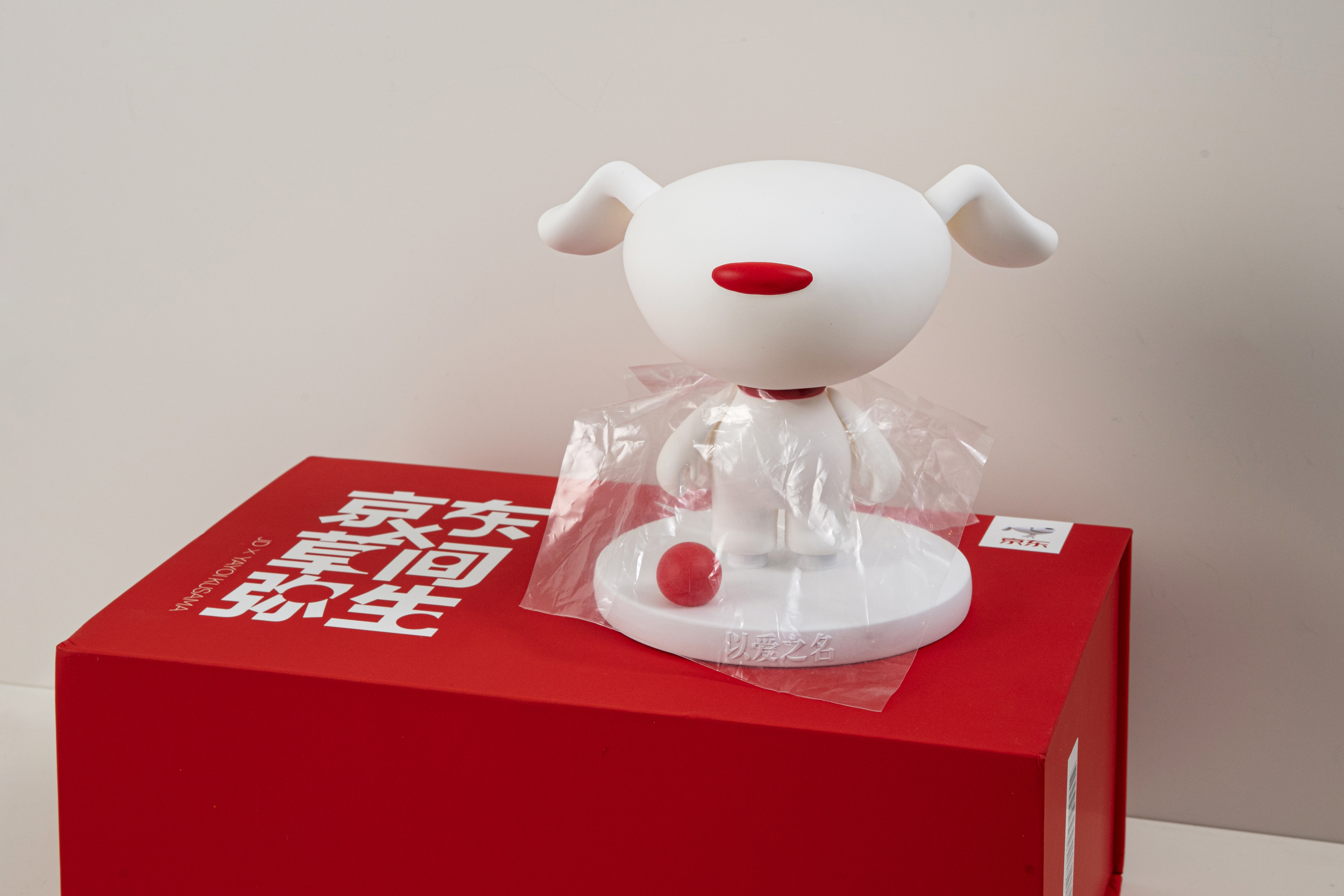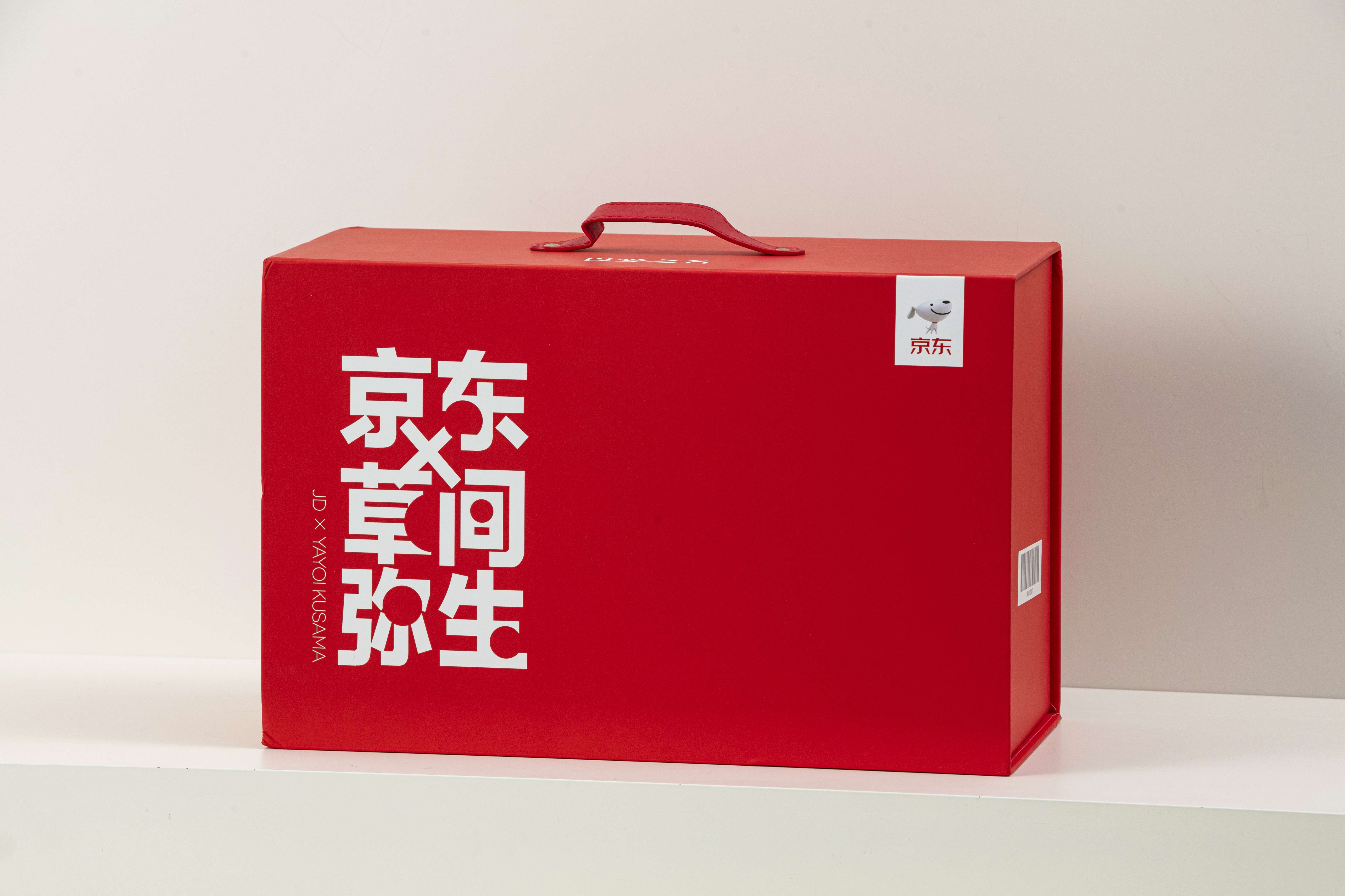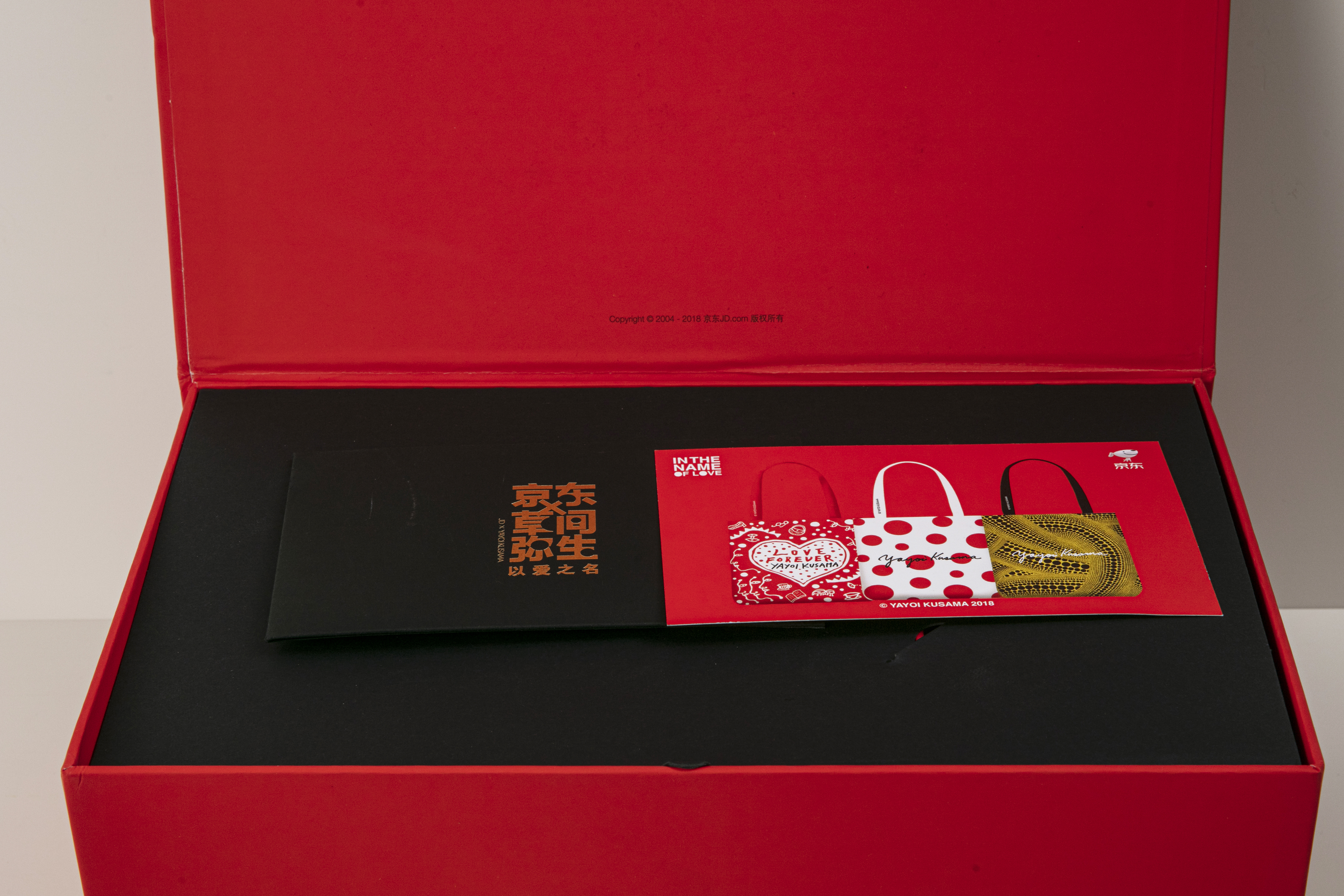 빨간색 박스안에, 쿠사마와 JD.com가 협력한 캔버스 가방과, JD.com로고 조각품이 들어가있다.