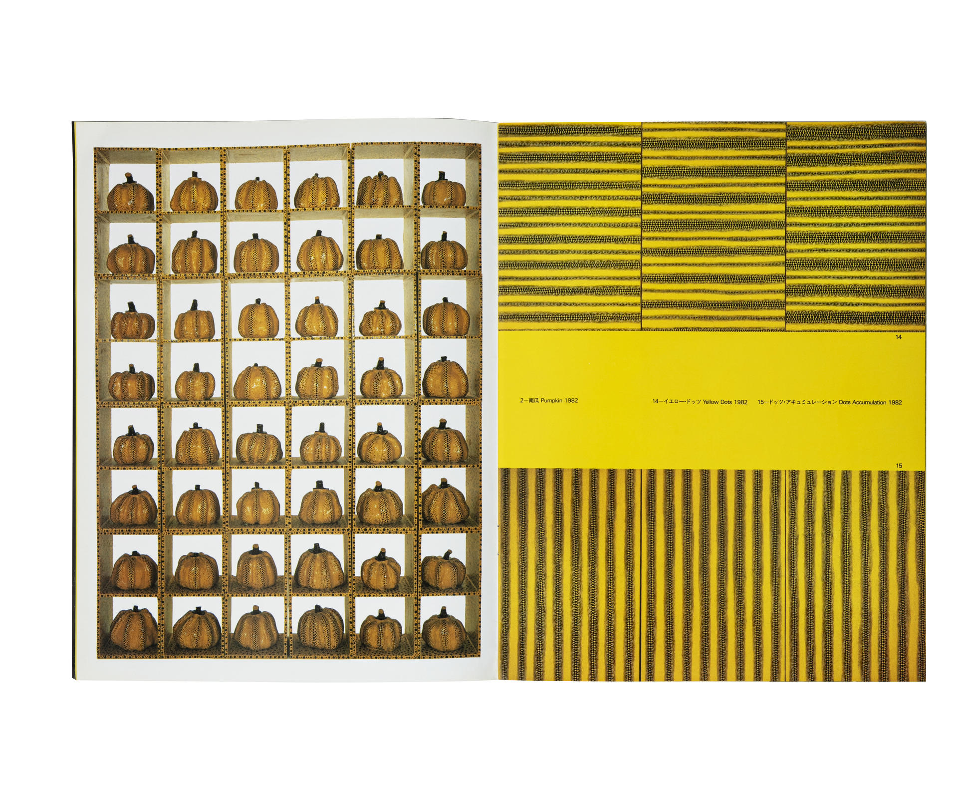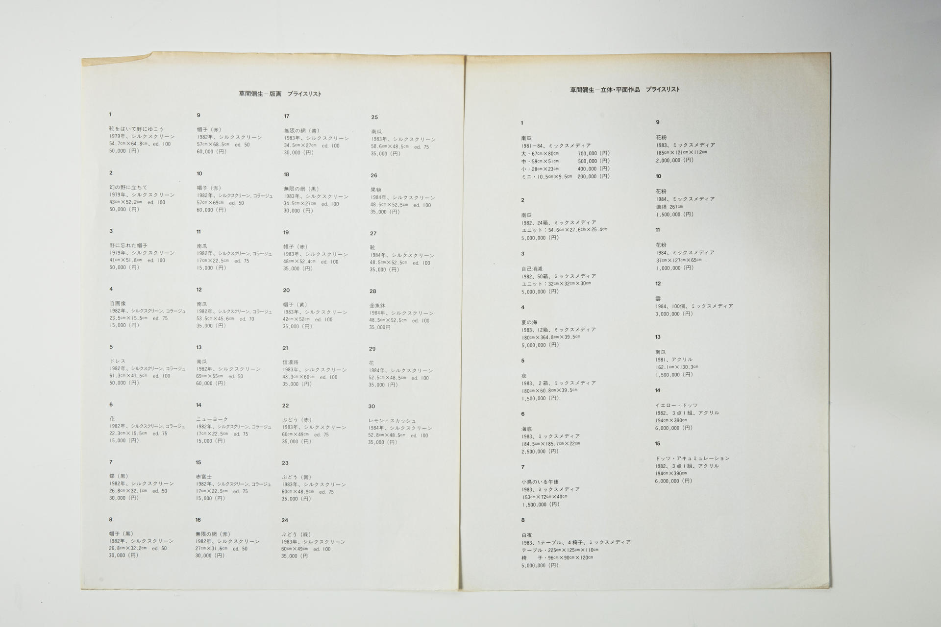 1984년 후지 텔레비전 갤러리에서 개최된 쿠사마 야요이의 개인전 카탈로그 및 출품작 작품가격표. 대표작 <Pumpkin>시리즈를 포함하여, 회화, 설치, 조각 등 장르를 막론한 작품 15점이 출품되었다.