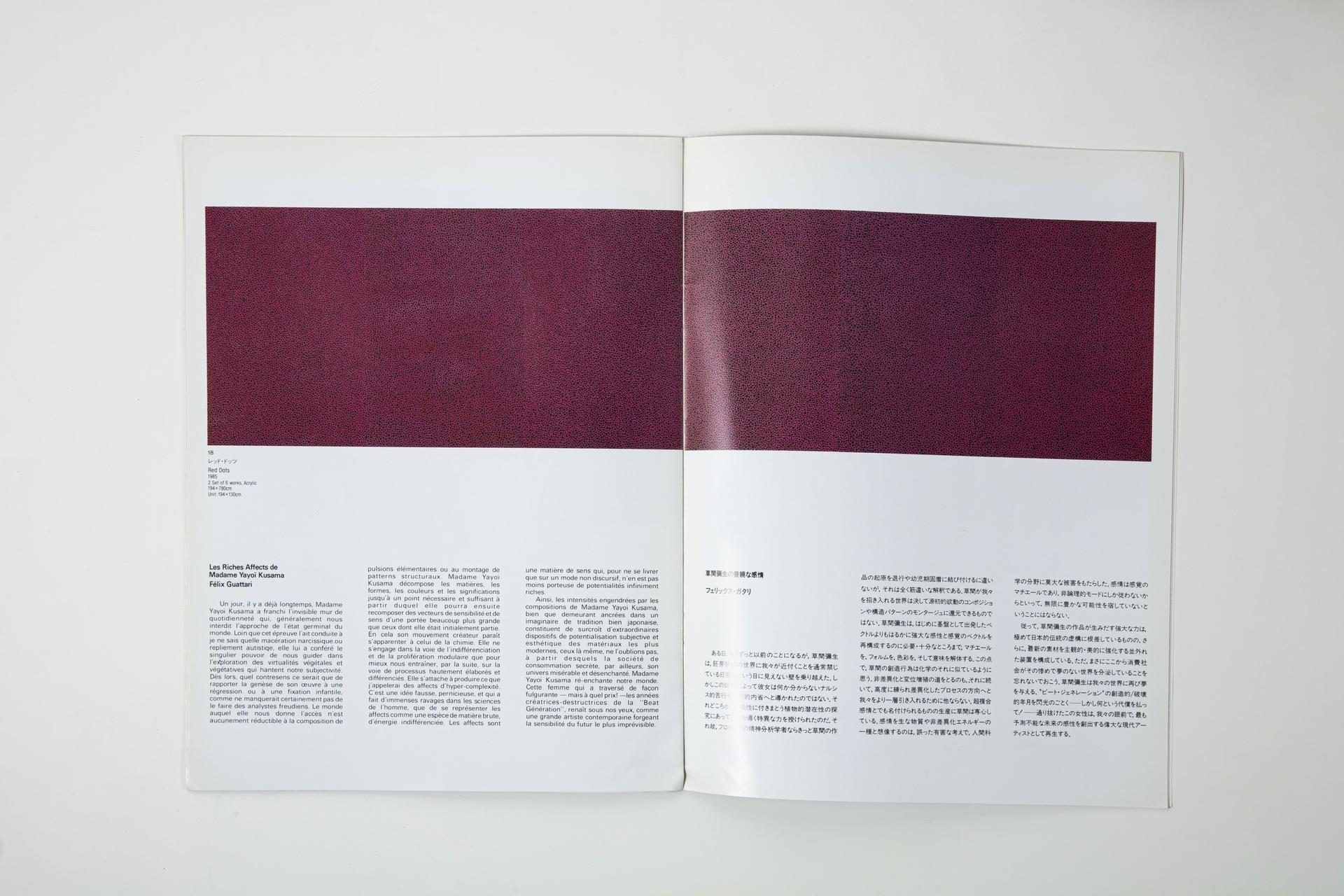 1986년 일본의 후지 텔레비전 갤러리에서 개최된 쿠사마 야요이의 개인전 카탈로그. 총 19점이 출품되었다. 작품가격표 포함.