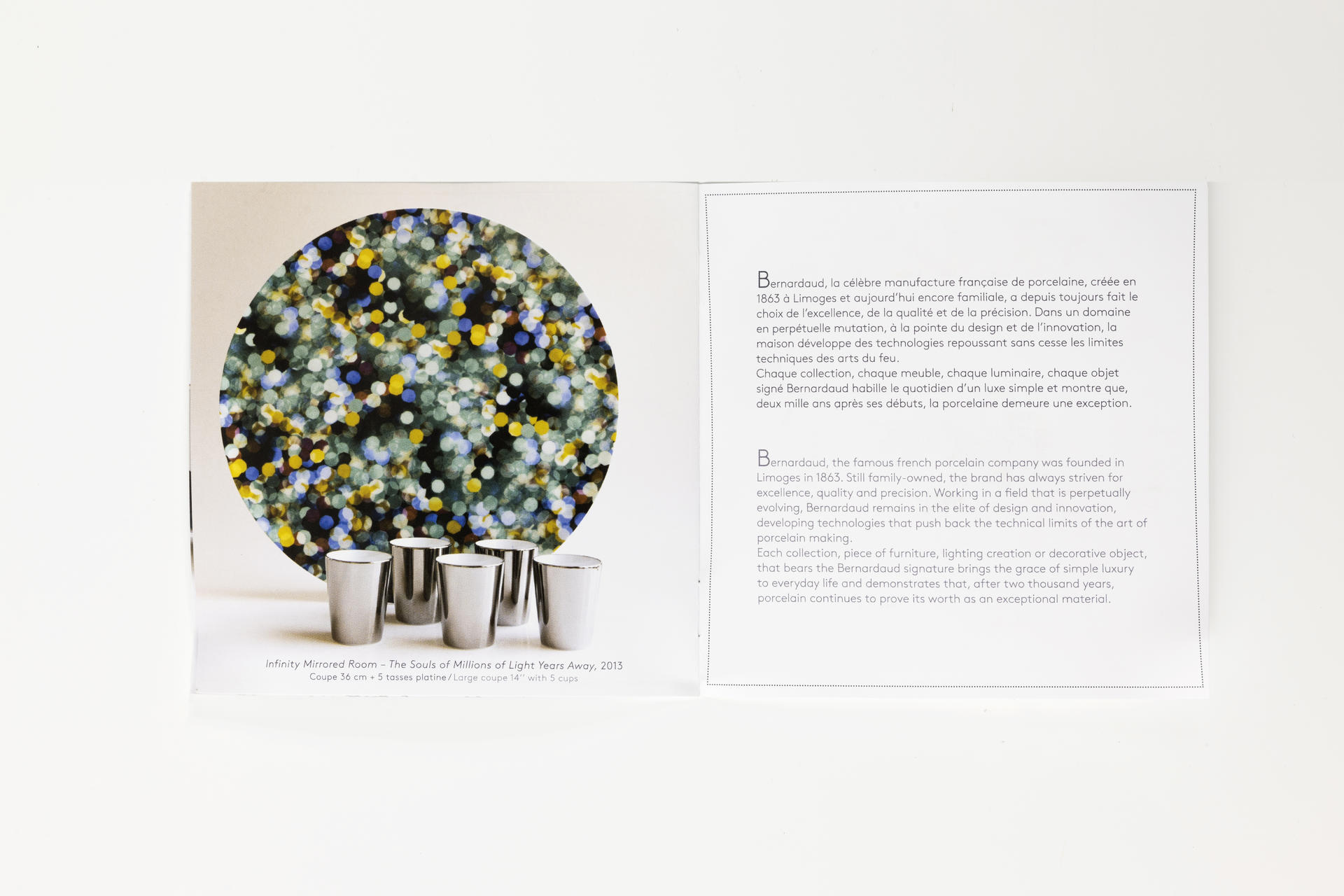 도자기 회사 <베르나르도(Bernardaud )>와 쿠사마가 협업한 이 컬렉션은 2017년 가을 로스앤젤레스의 브로드미술관에서 열린 <인피니티 미러(Infinity Mirrors)의 개관에 맞추어 만들어졌다.