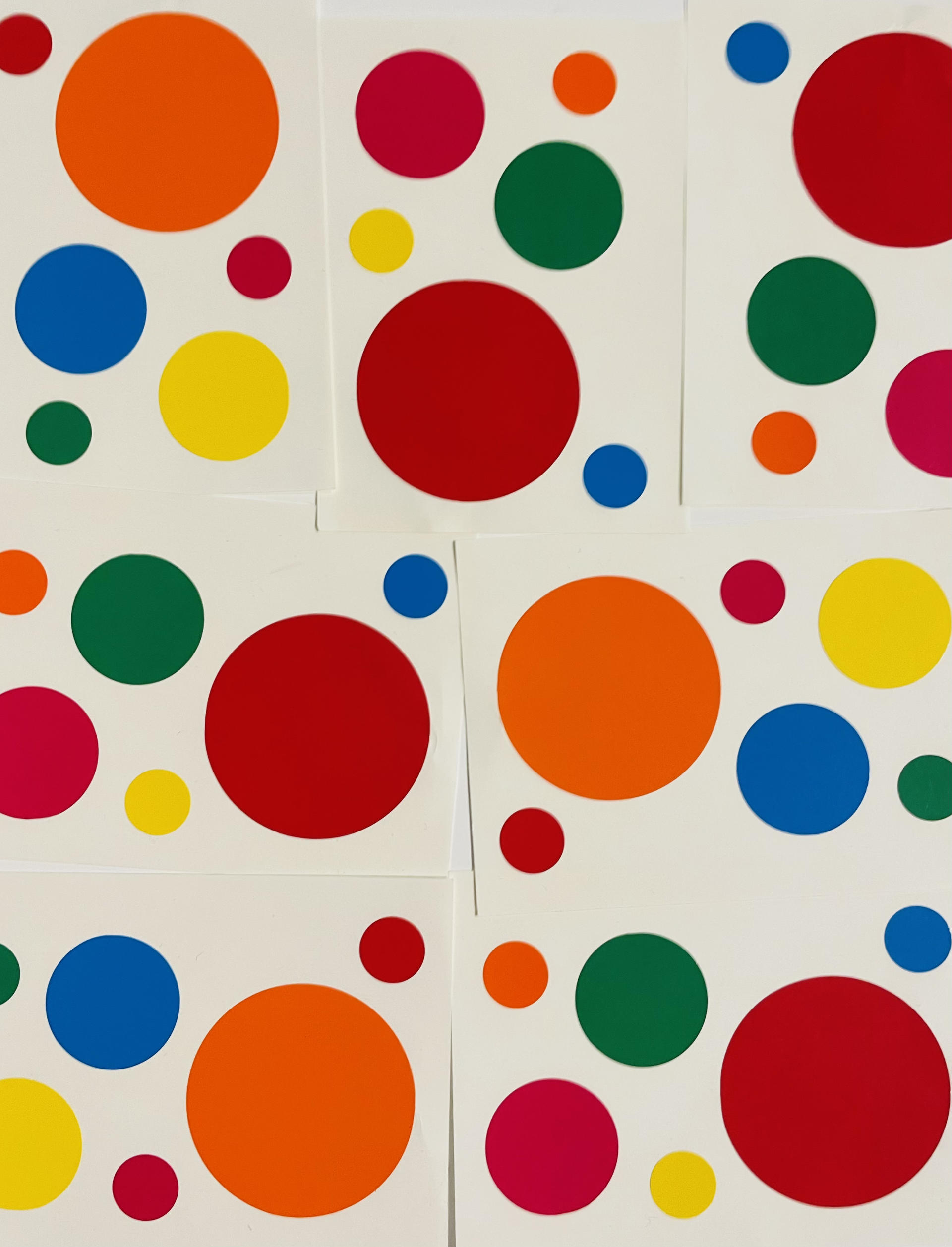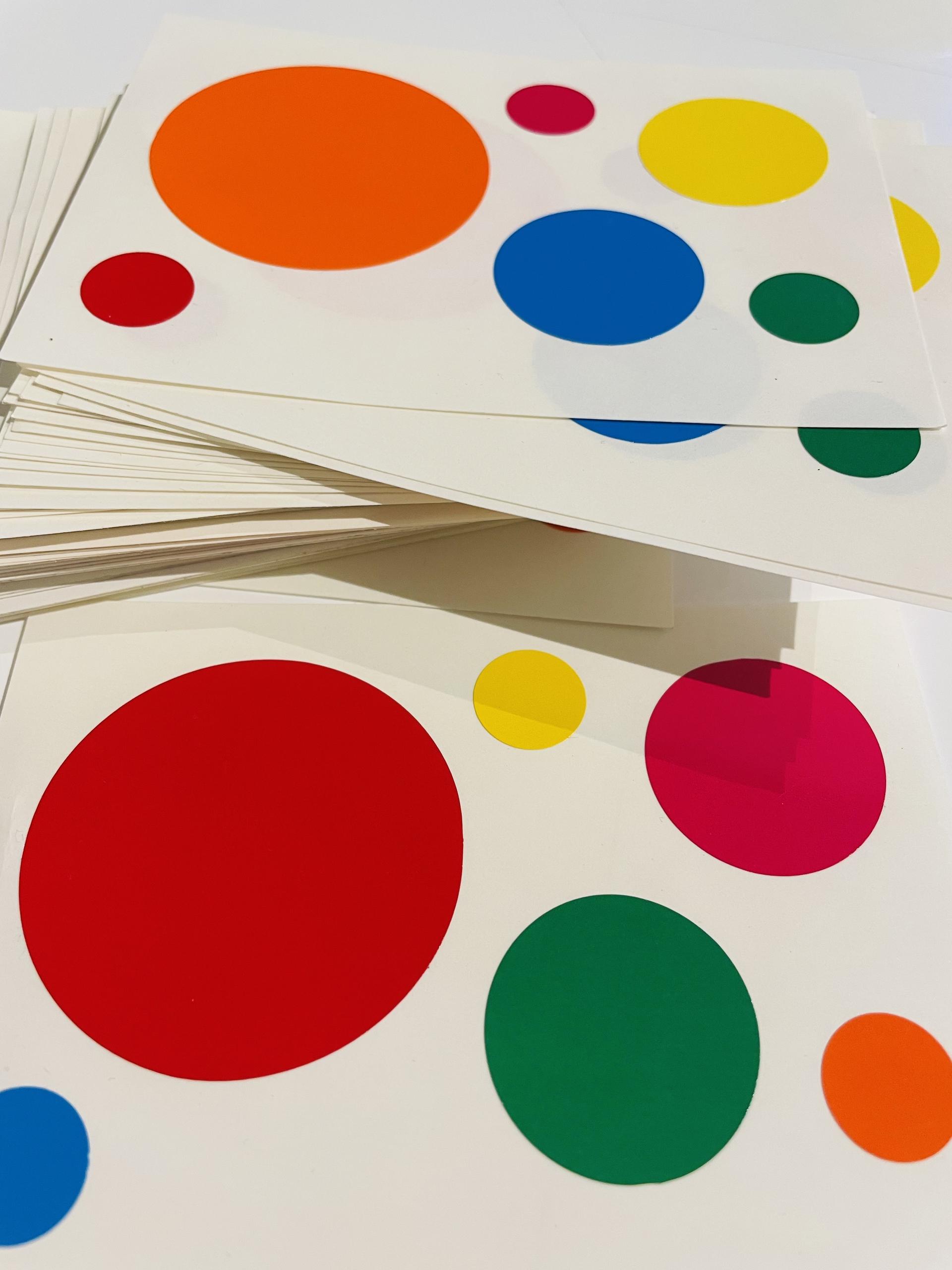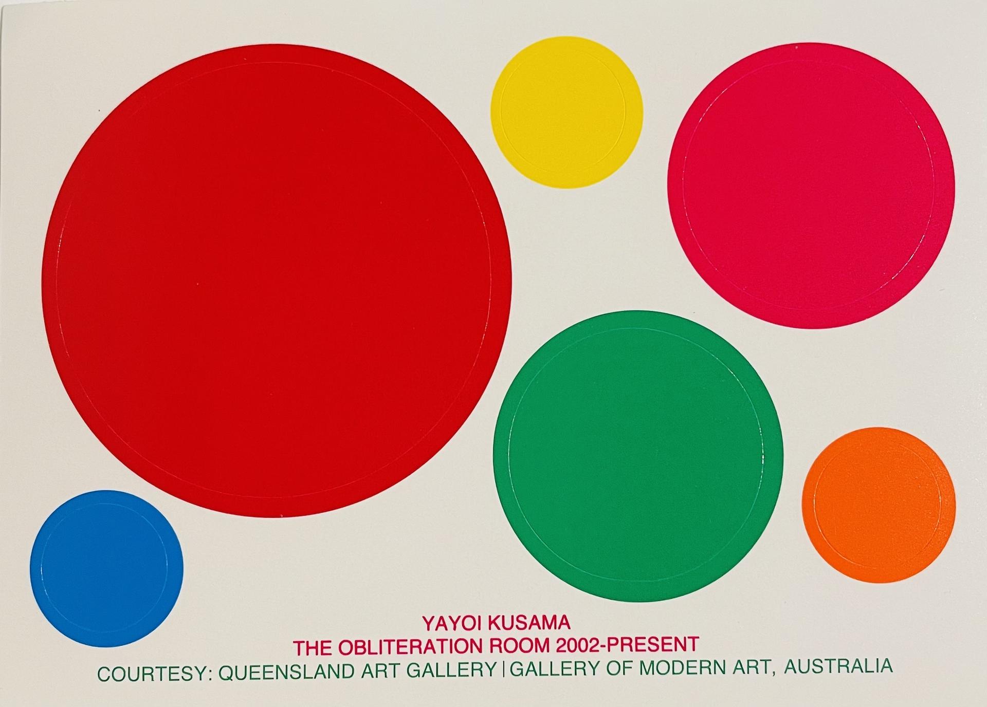 퀸즐랜드 갤러리, 오스트리아 현대미술관에서 전시된 <소멸의 방(Obliteration Room)> 전시 이벤트에 사용된 스티커. 쿠사마의 대표작 <소멸의 방>은 관객 참여 전시로, 관객들은 배부받은 스티커로 온통 하얗게 칠해진 방 안을 가득 채우게 된다. 시간이 지날수록 흰색의 방은 형형색색의 쿠사마의 폴카 닷으로 빽빽히 채워진다.