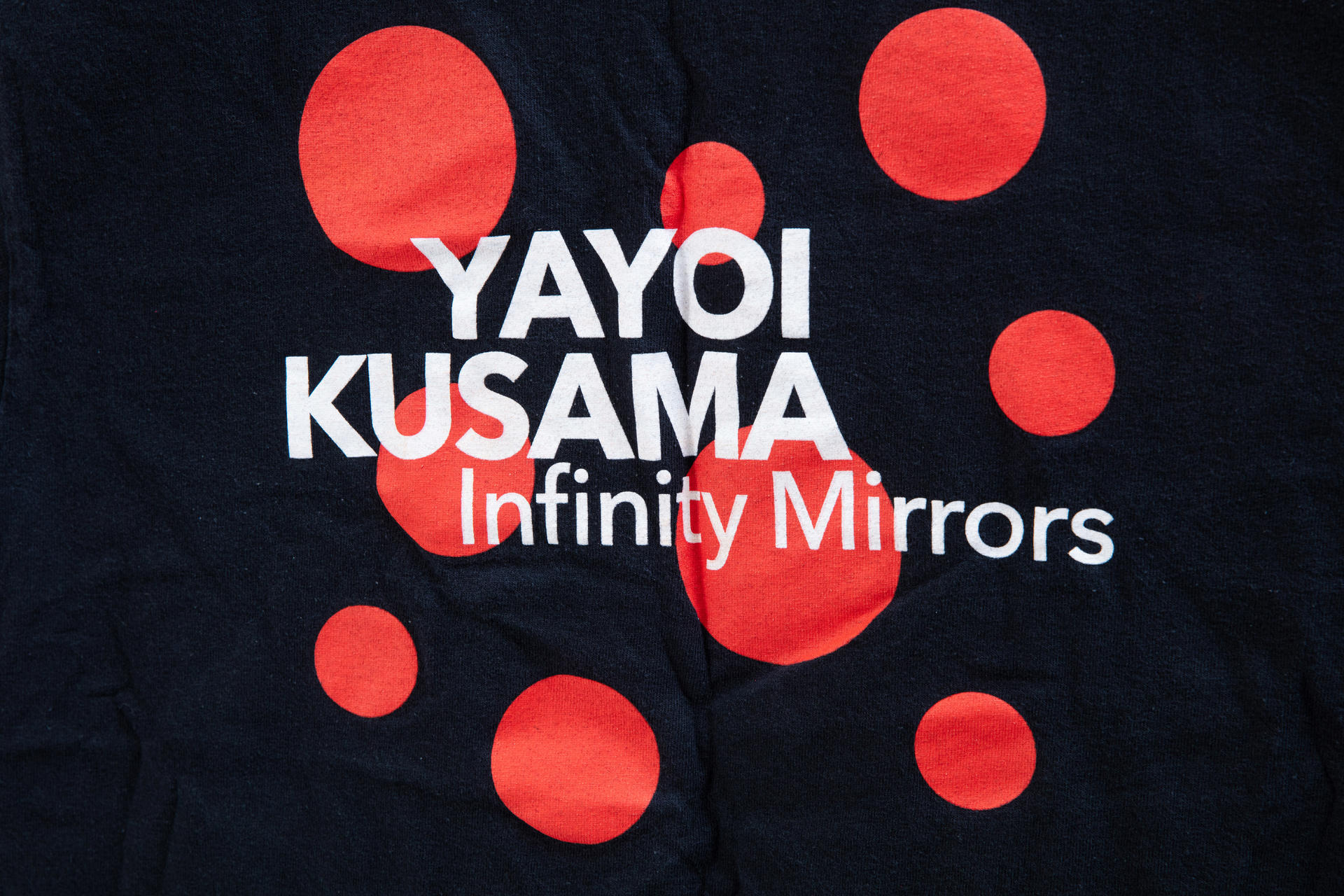 2018년 아틀랜타 하이미술관(HIGH Museum of art ATLANTA)에서 개최된 쿠사마의 <무한의 거울(Infinity Mirrors)> 전시의 스텝 티셔츠. 전시의. 6개 방 각각은 쿠사마의 1950년대 초엽부터 현재까지 이어지는 조각, 회화, 텍스트를 포함한 대규모 작품들이 전시되었다.