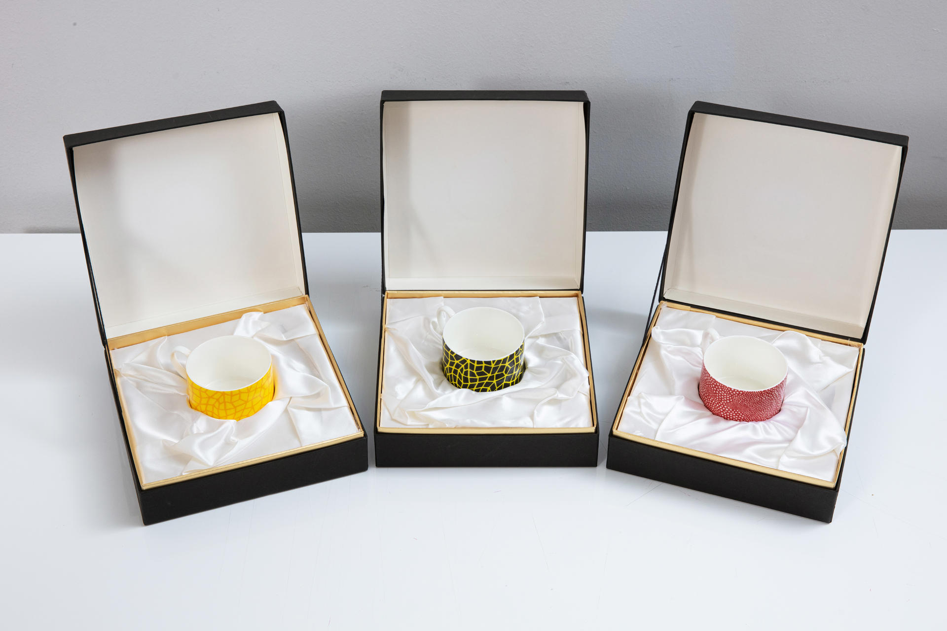 Kusama Infinity Nets Cup&Saucer Set (3 sets), Porcelain wet fitted in a black paper box with gold lettering and white textile lining, signed, titled, annotated, and numbered, '88/500', under glaze, issued in 1988 by Grappi Edition, Japan