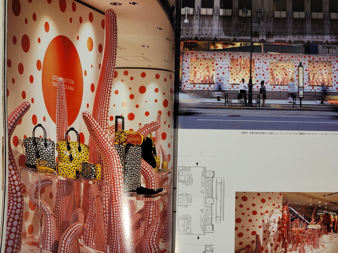 쿠사마는 2012년 루이 비통과 컬래버레이션을 진행한다. 같은 해 도쿄의 긴자(ぎんざ )에 스트리트 마켓을 열었고, 2012년 7월 18일부터 31일까지의 총 2주간, 일본 최대 규모를 자랑하는 이세탄 백화점에 기간 한정 컨셉스토어(LOUIS VUITTON-YAYOI KUSAMA at ISETAN)를 열었다. 이세탄 컨셉스토어가 소개되고 있는 잡지. 해당 공간에는 쿠사마의 대표작인 <신경(Nerves)>이 전시되어 있다.