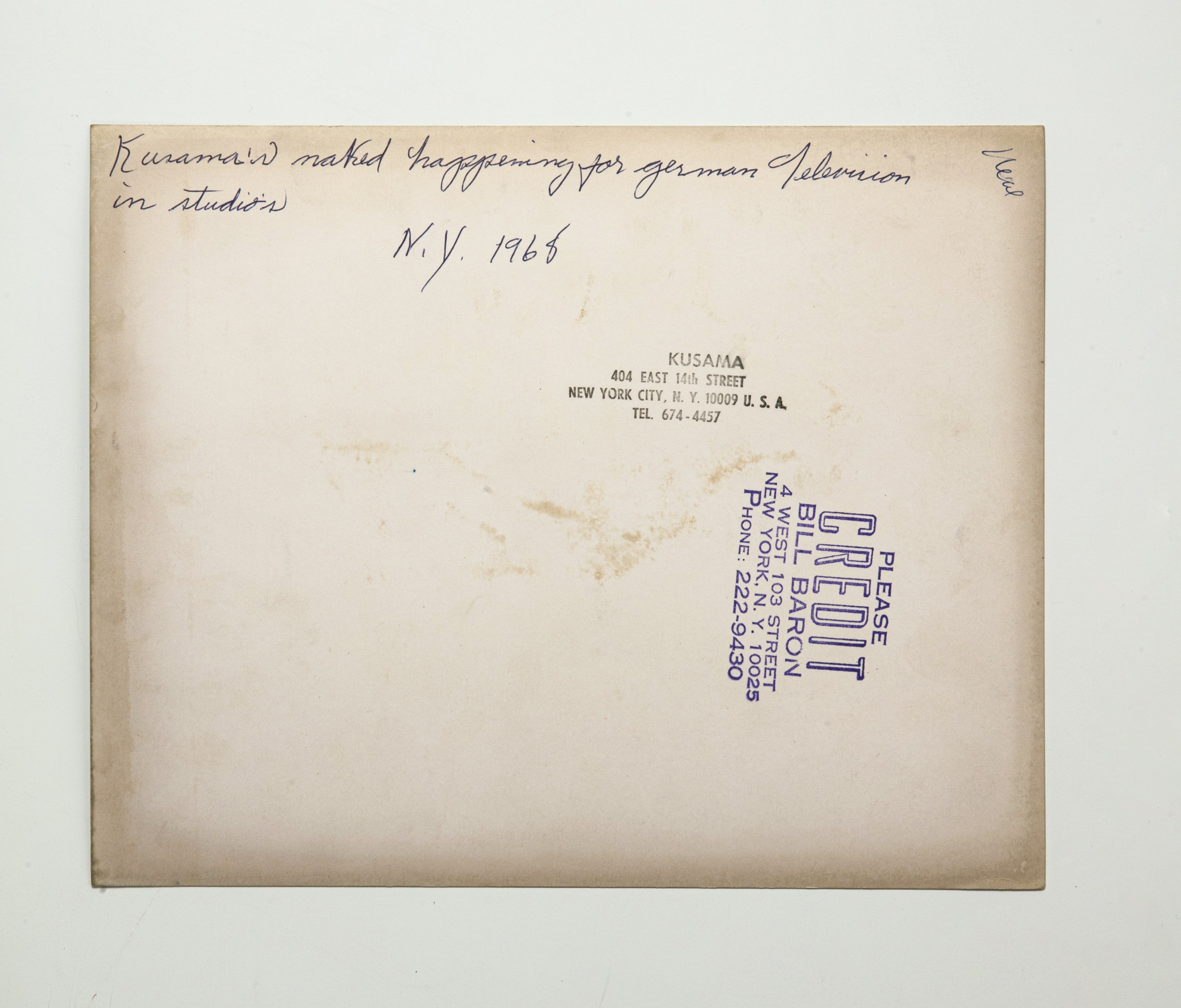 쿠사마가 빌 바론에게 보낸 흑백사진. 쿠사마의 뉴욕 주소가 새겨진 소인이 찍혀있다.